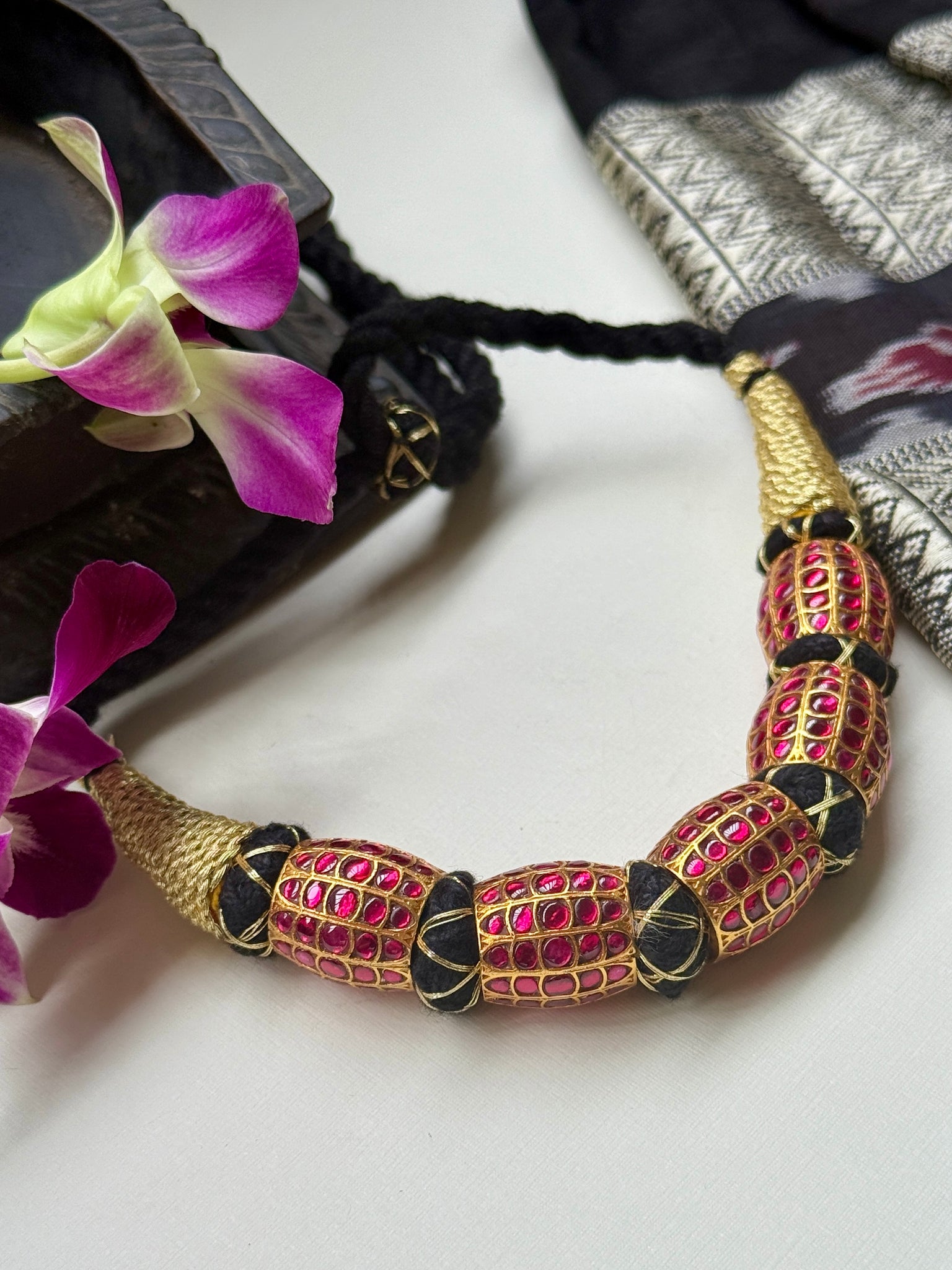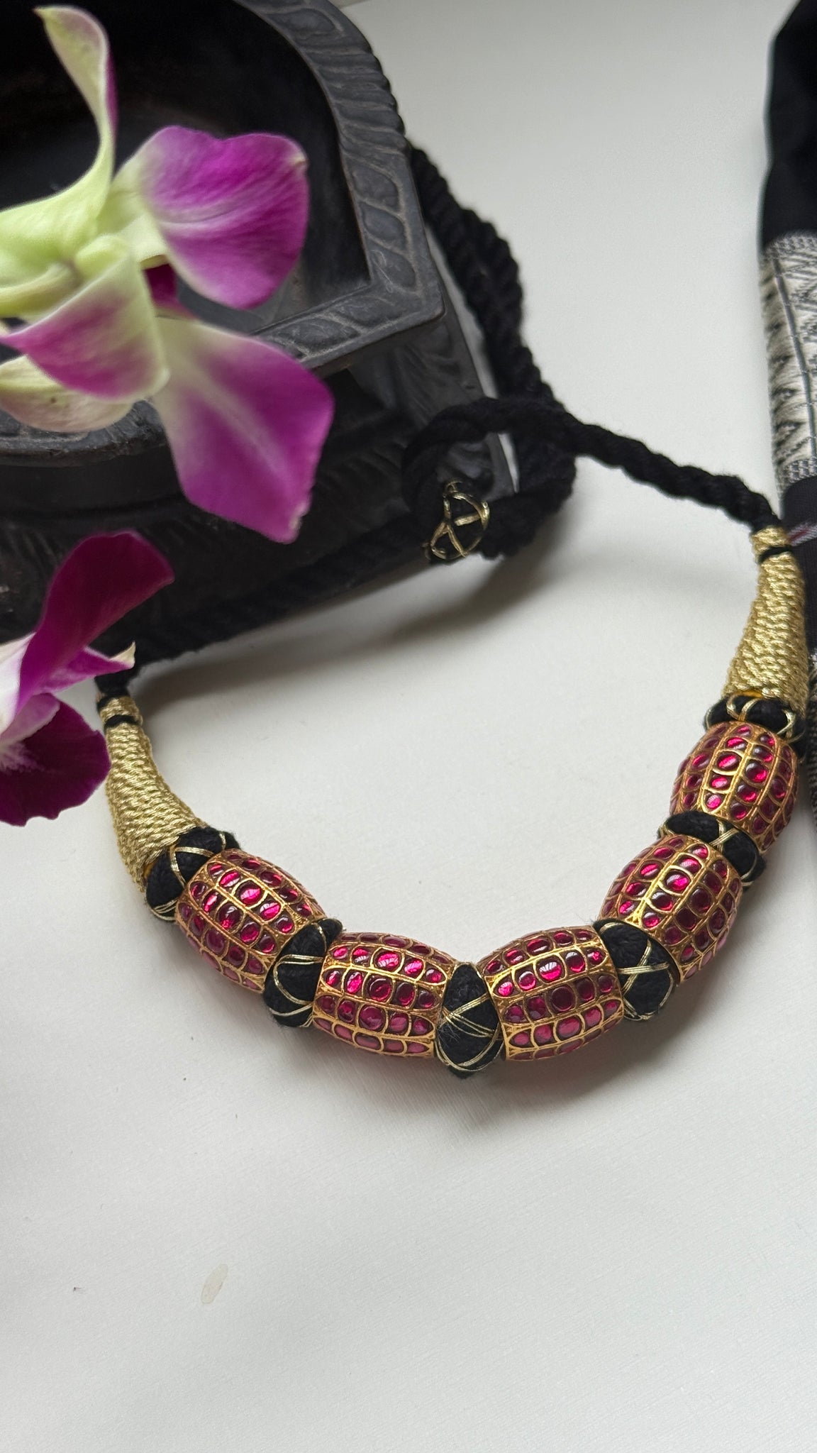 traditional-style necklace featuring a prominent pendants with Kundan work , black and gold thread coiled along the length of the neck peice giving a rich traditional look.