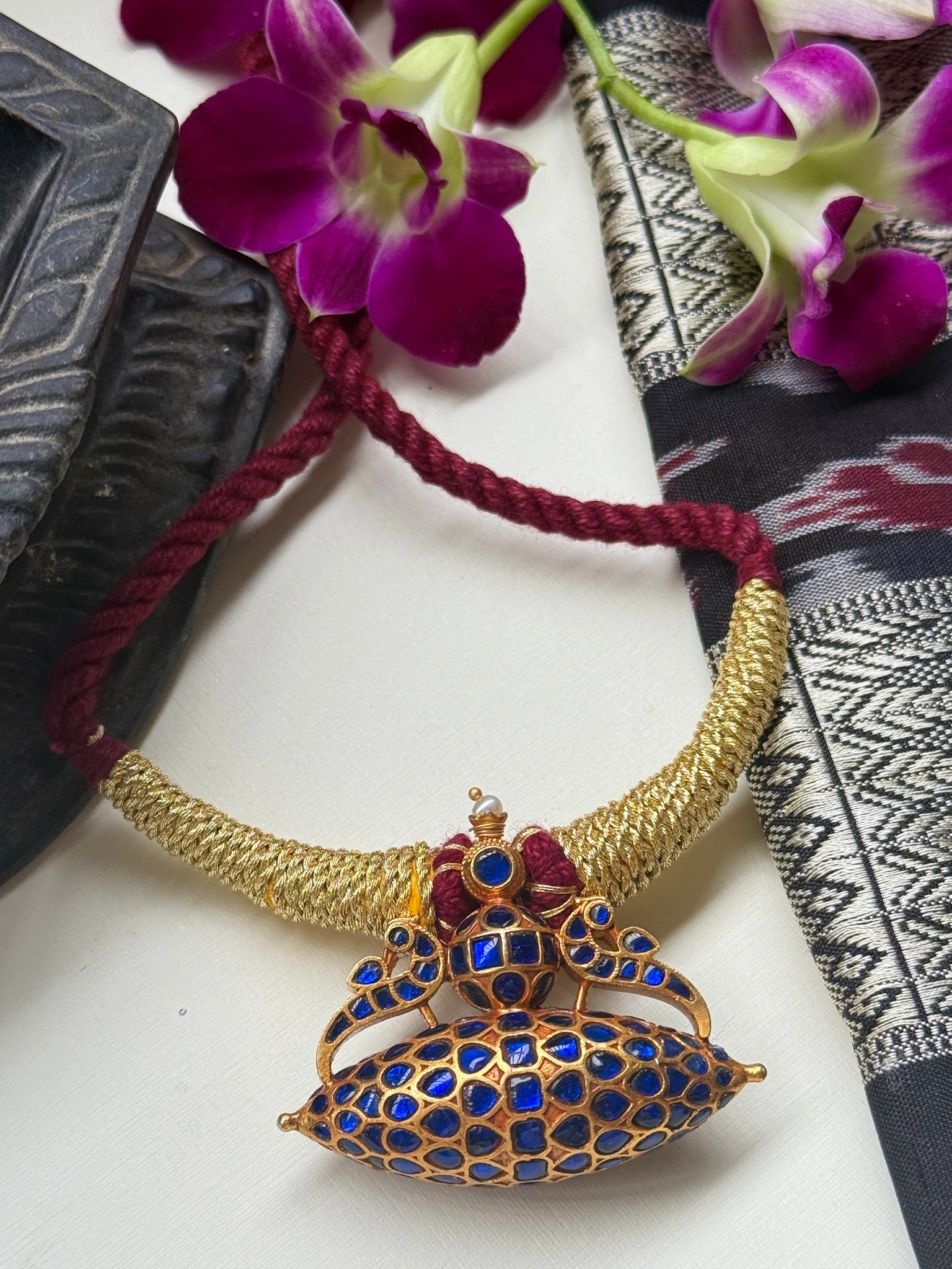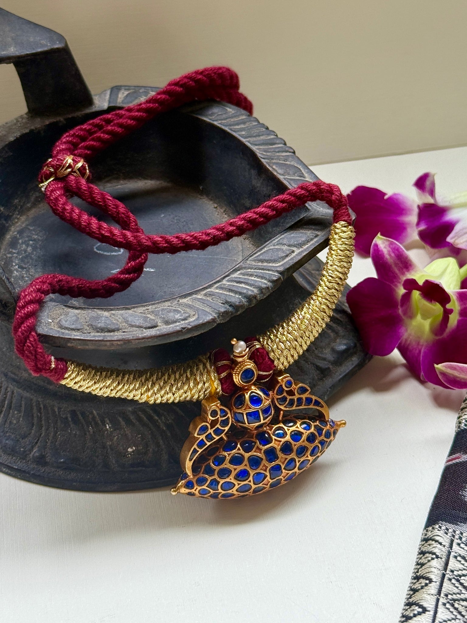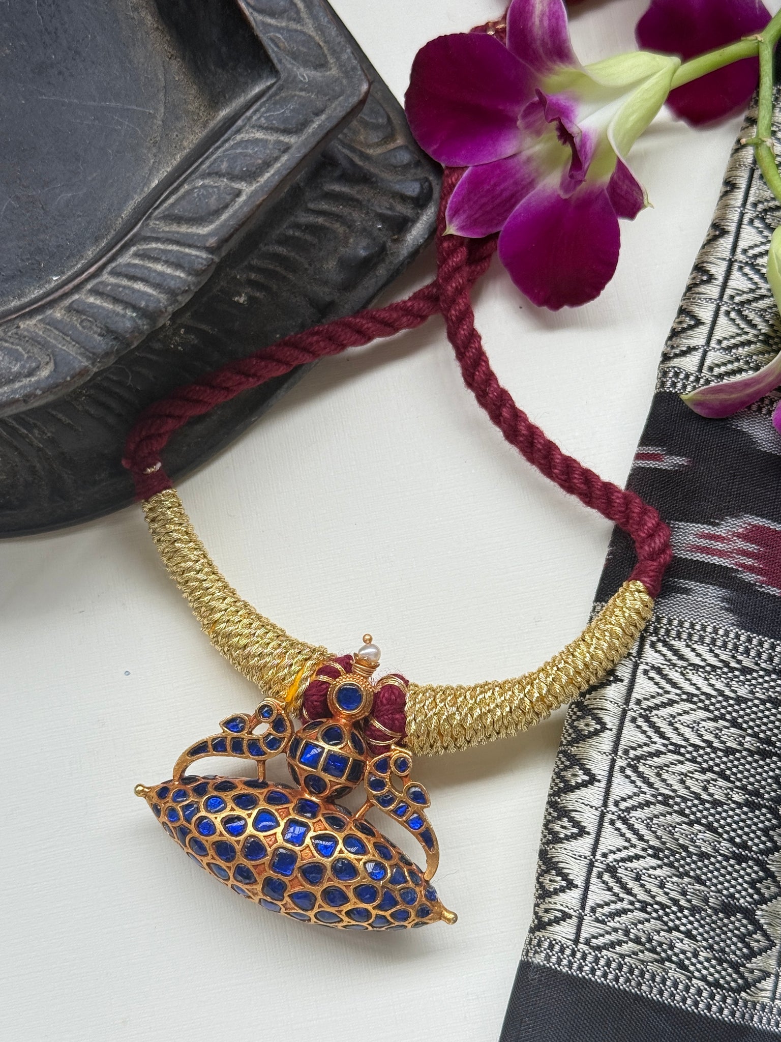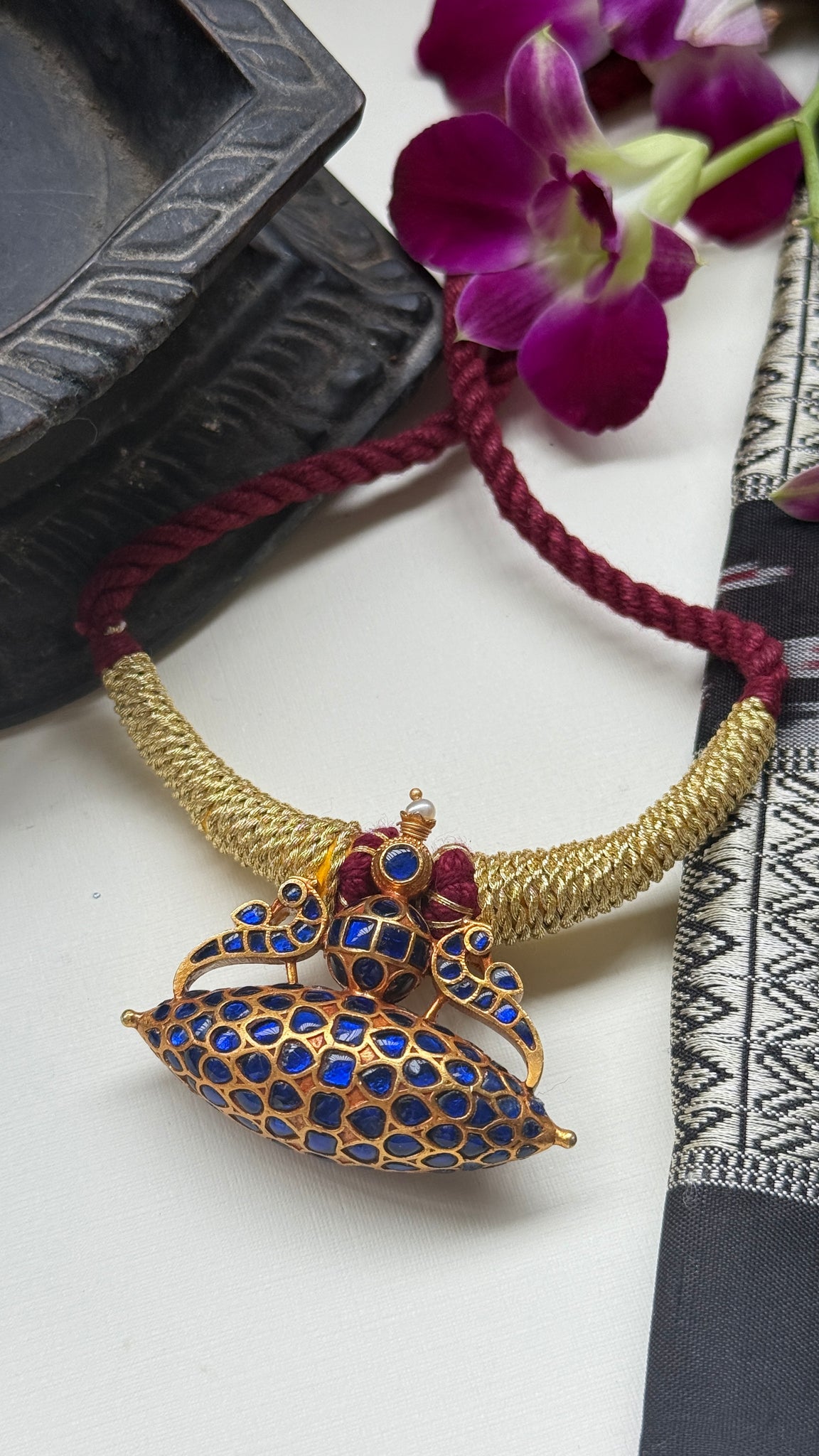 traditional-style necklace featuring a prominent pendant with Kundan work and peacock motifs and either sides , gold thread coiled along the length of the neck peice giving a rich traditional look.