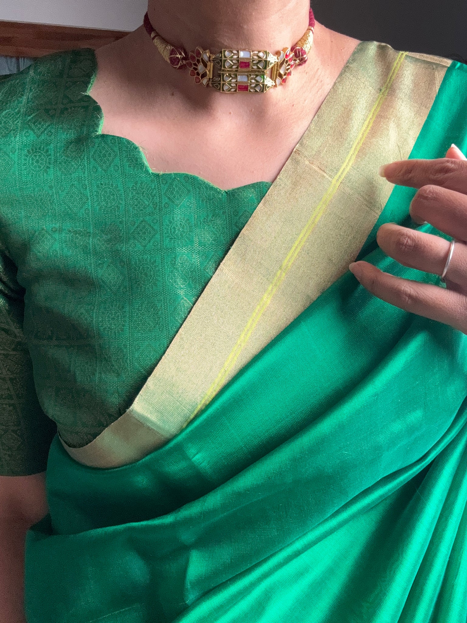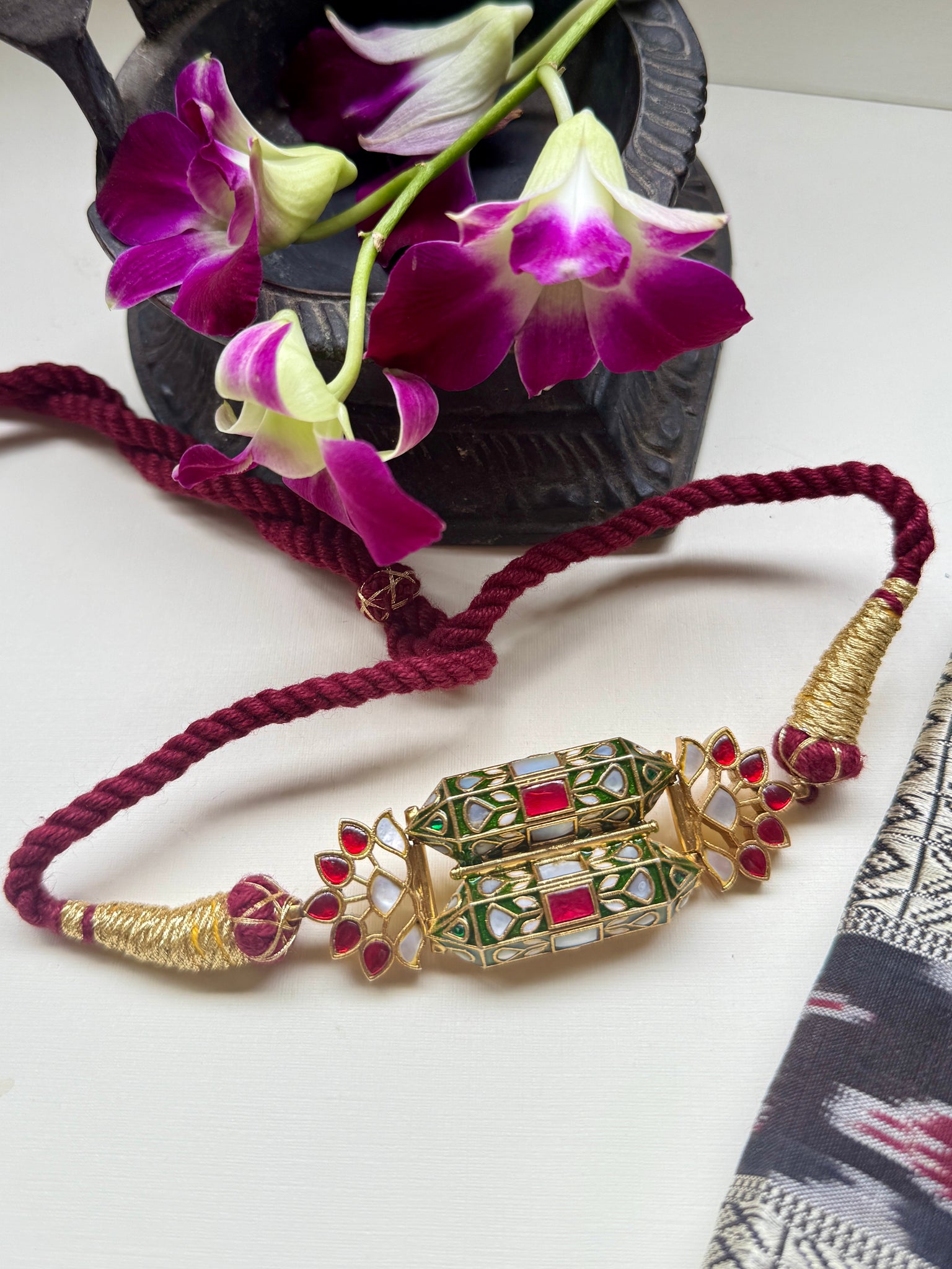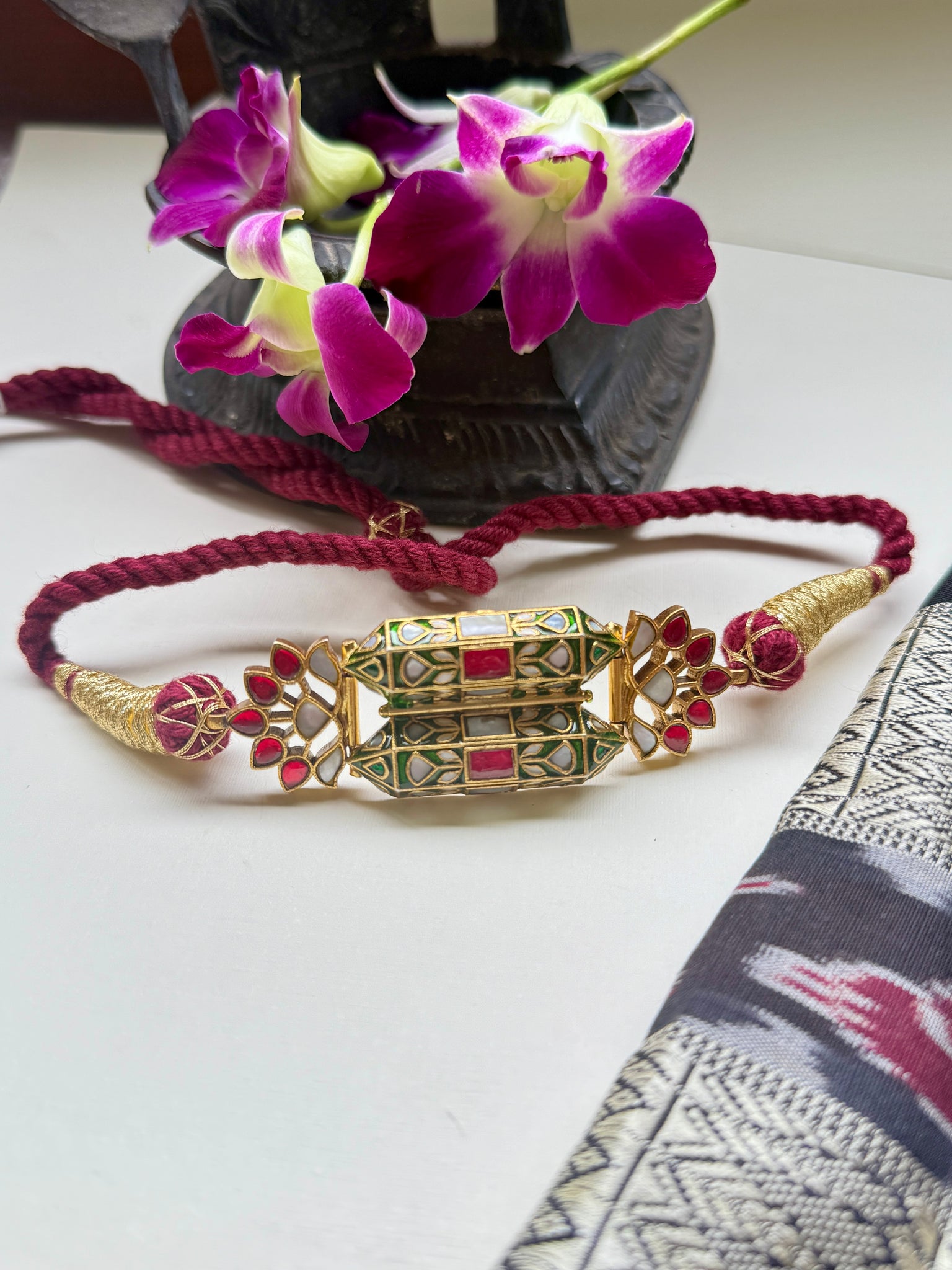 A traditional Indian-style necklace or choker featuring a central ornamental piece strung on a green braided cord , ornamental peice made up of pure 92.5 silver and intricate meenakari work done with Kundan red and green and mother of pearls (white) predominantly characteristic’s of our rich craftsmanship.