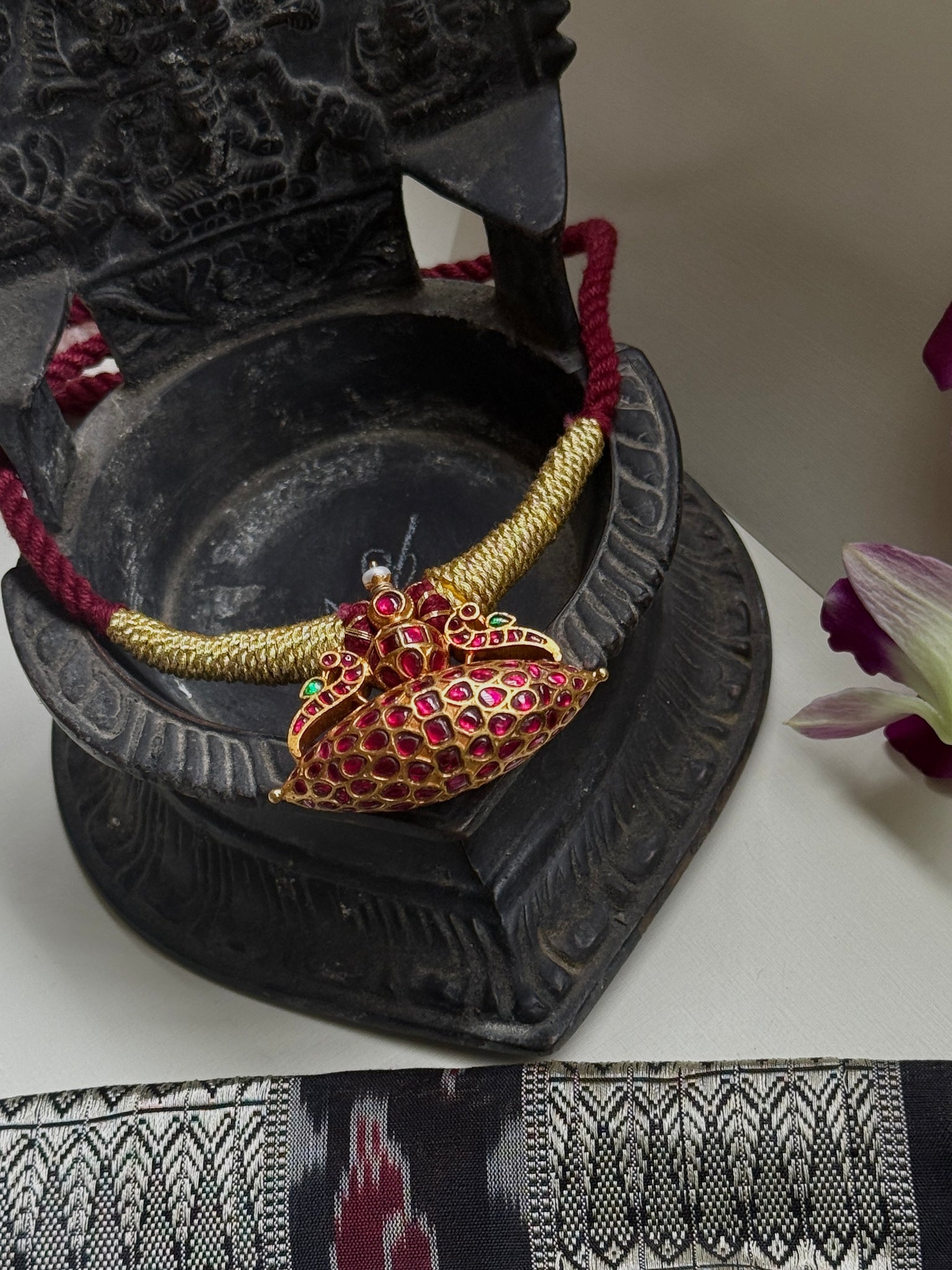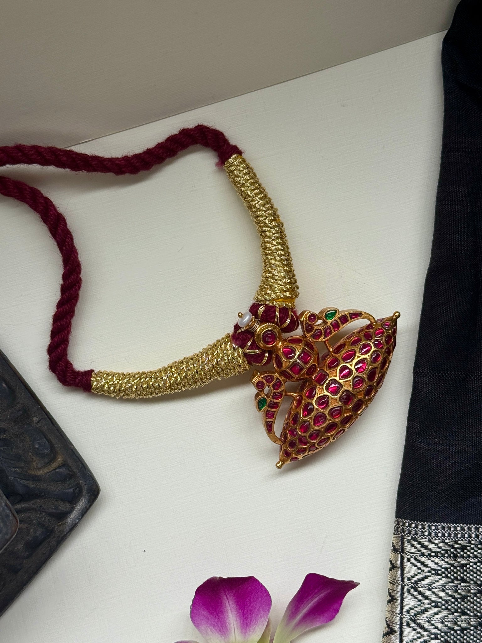 traditional-style necklace featuring a prominent pendant with Kundan work and peacock motifs and either sides , gold thread coiled along the length of the neck peice giving a rich traditional look.