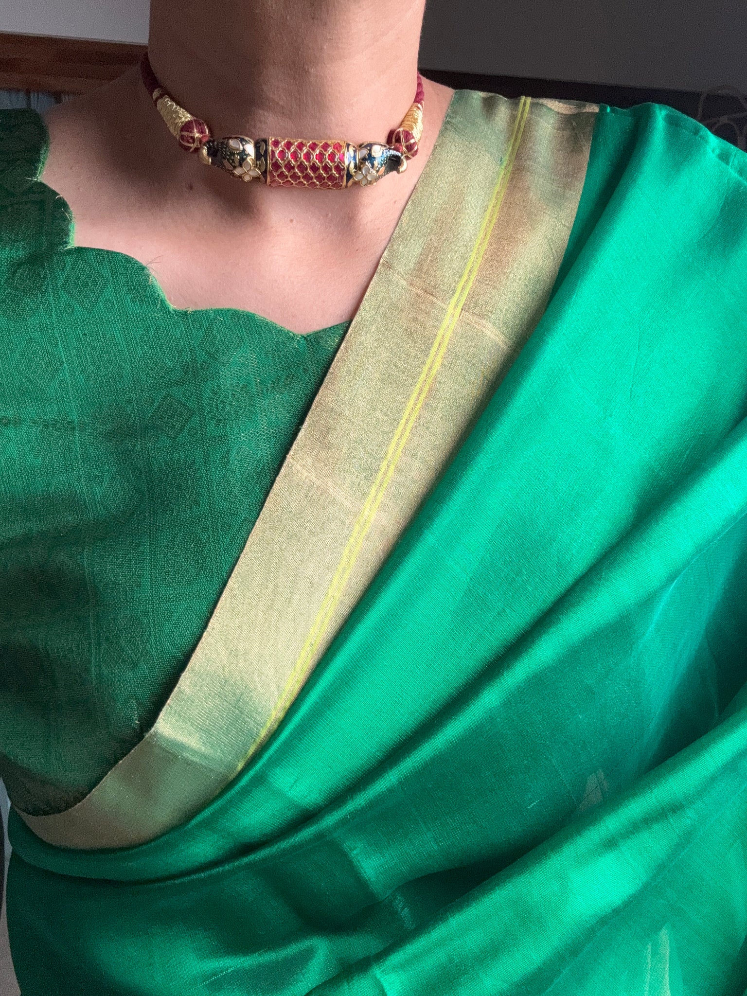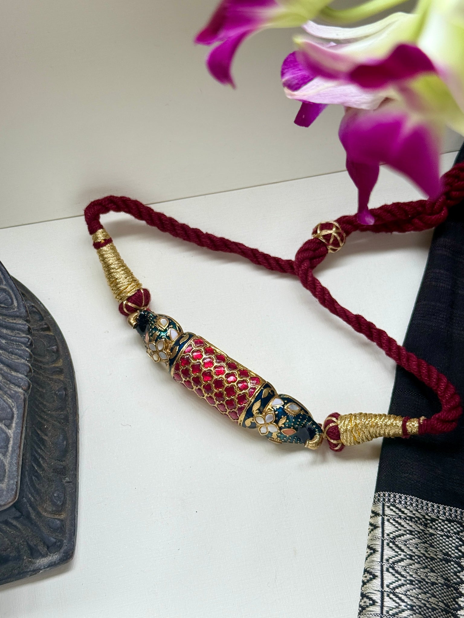 A traditional Indian-style necklace or choker featuring a central ornamental piece strung on a green braided cord , ornamental peice made up of pure 92.5 silver and intricate meenakari work done with Kundan red and green and mother of pearls (white) predominantly characteristic’s of our rich craftsmanship.