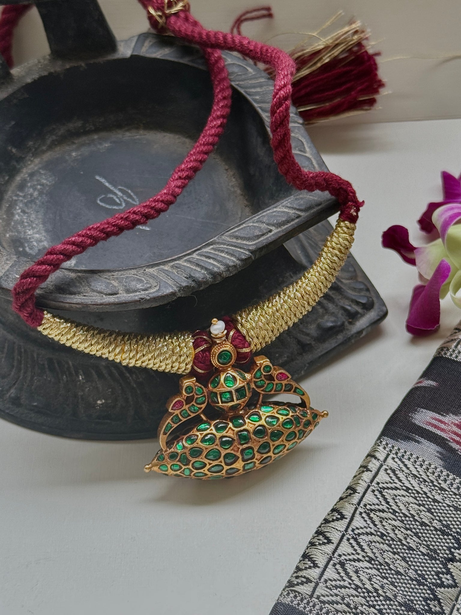 traditional-style necklace featuring a prominent pendant with Kundan work and peacock motifs and either sides , gold thread coiled along the length of the neck peice giving a rich traditional look.