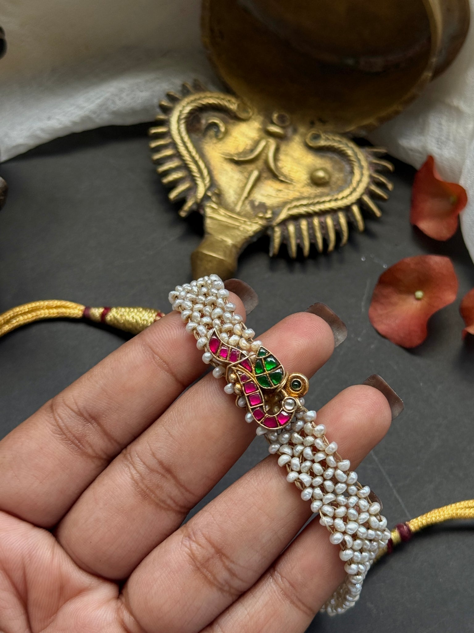 This pearl necklace is handcrafted in silver with a beautiful peacock motif kundan pendant .In this necklace the pearls are strung in a way that it looks like a weave.A versatile piece that is made by our master artisan for our new collection .