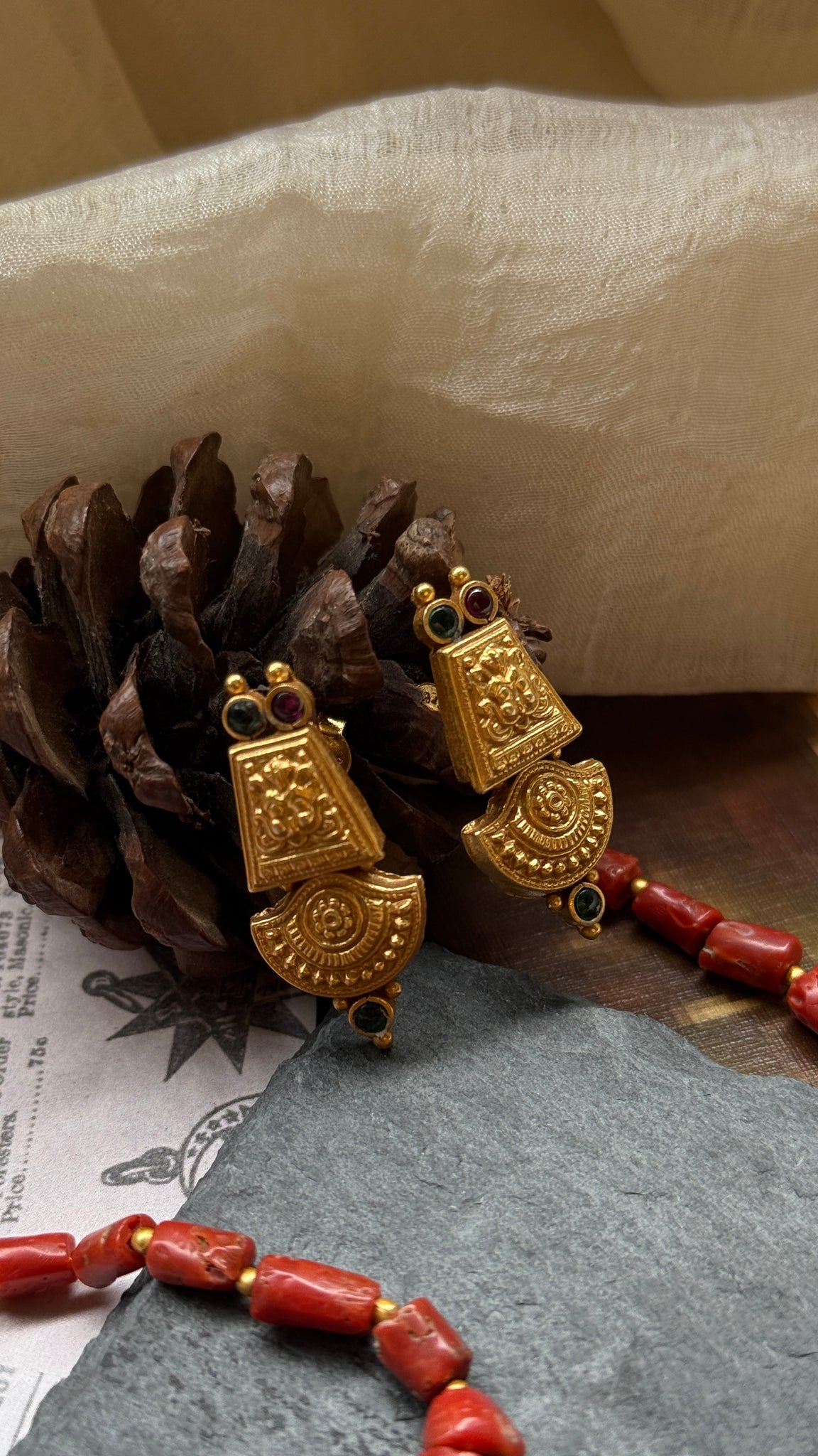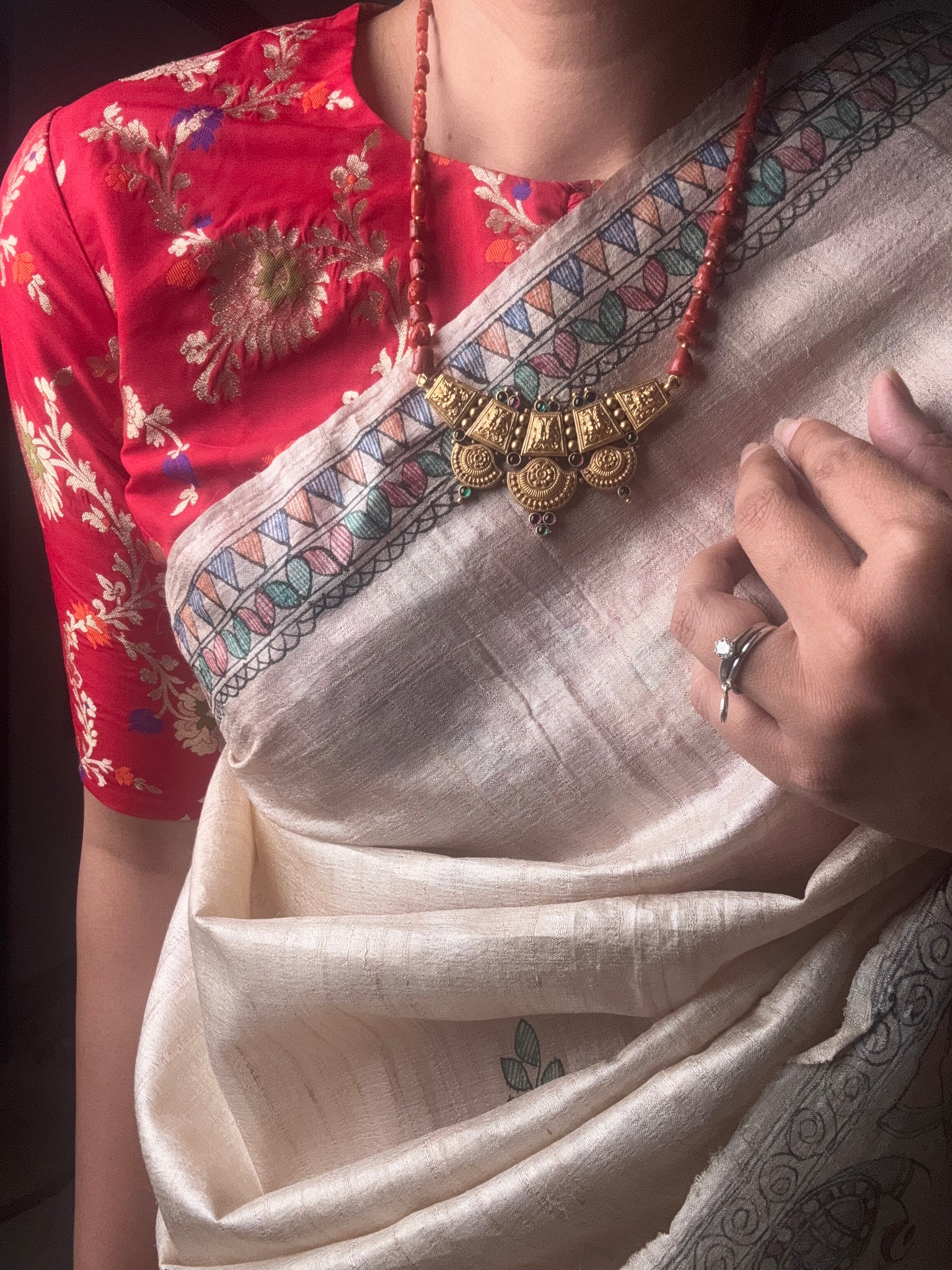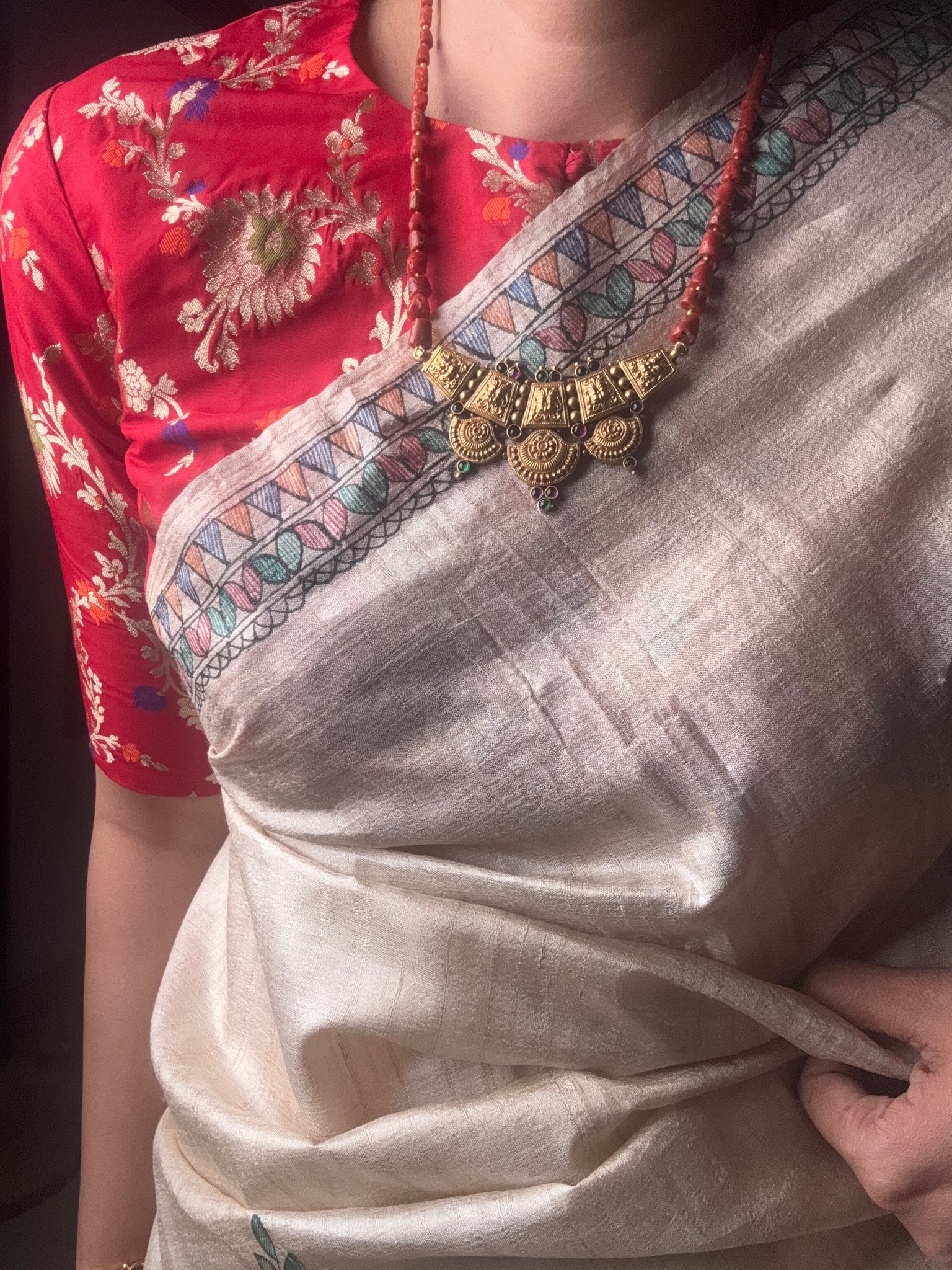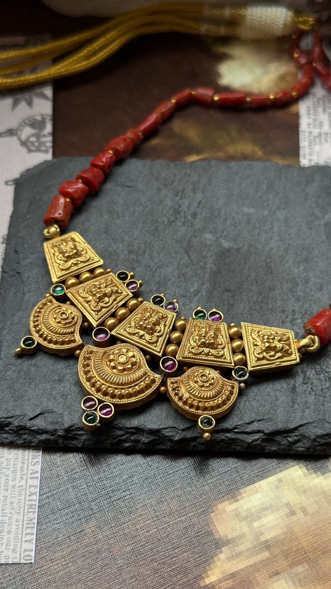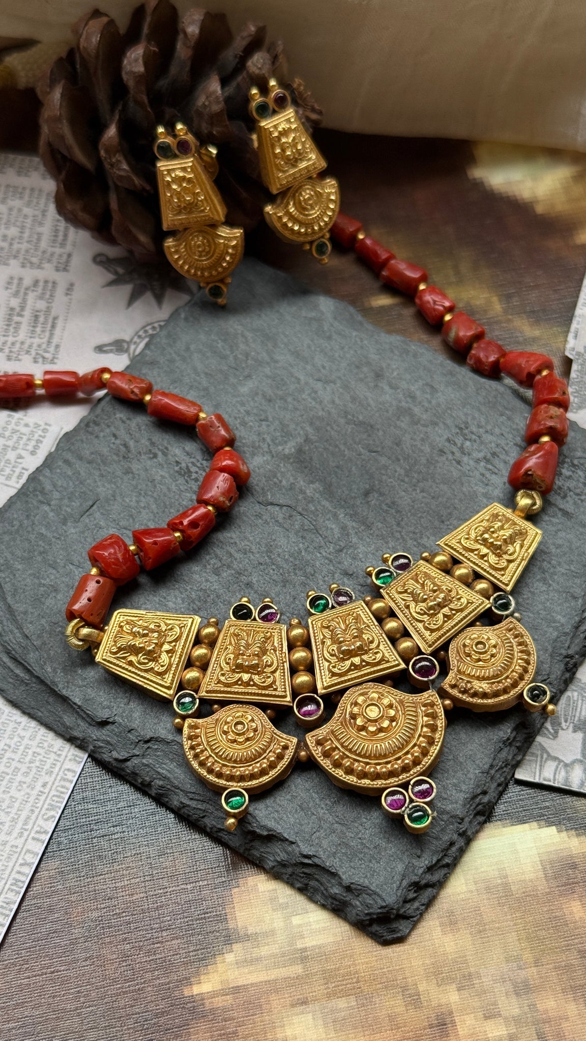 This necklace is handcrafted in silver with a beautiful intricate nakshi work pendant with natural raw corals and gold polished silver beads strung together . A versatile piece that is made by our master artisan ,from our newest of the festive kundan collection for the year 2025.
