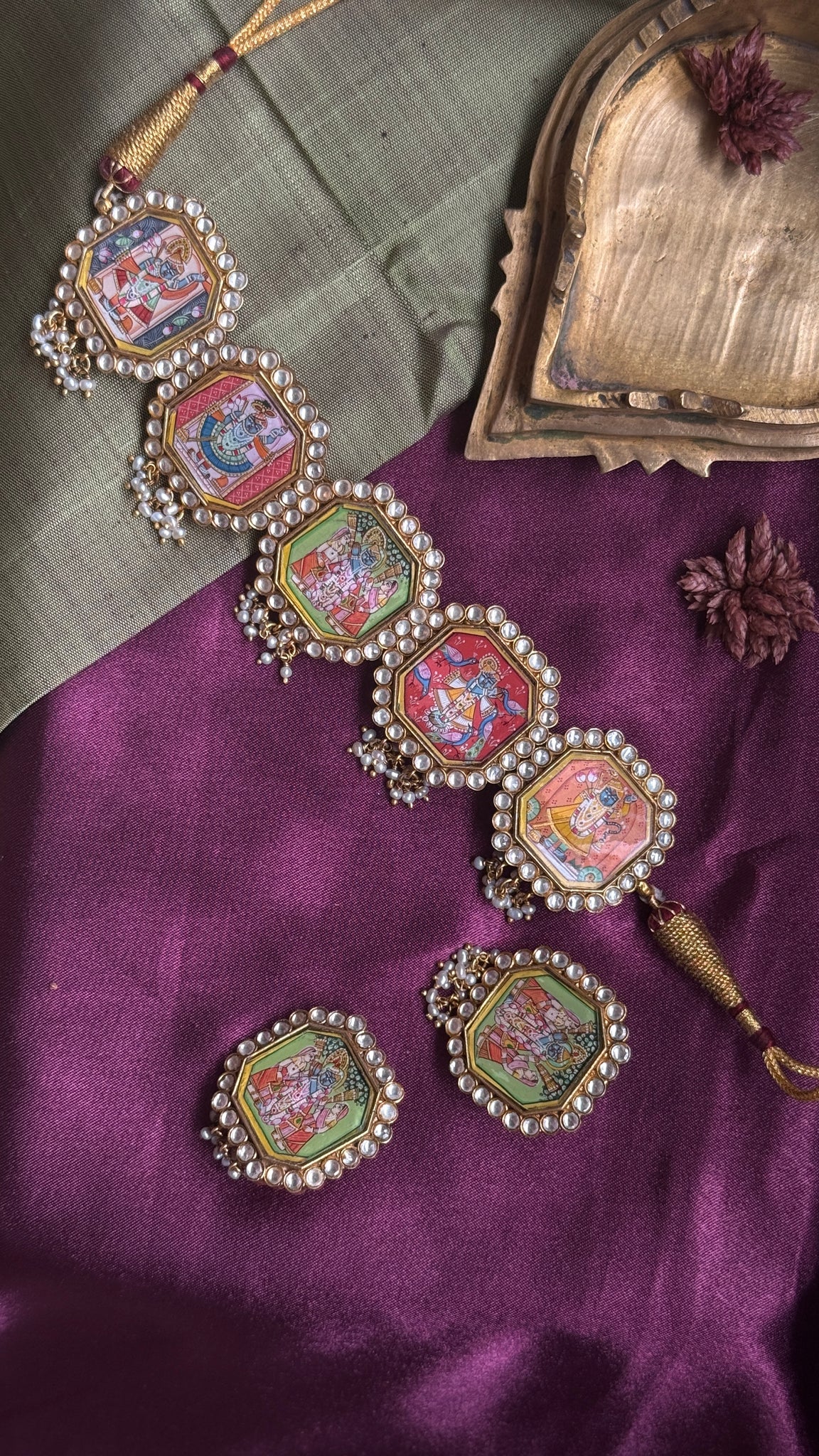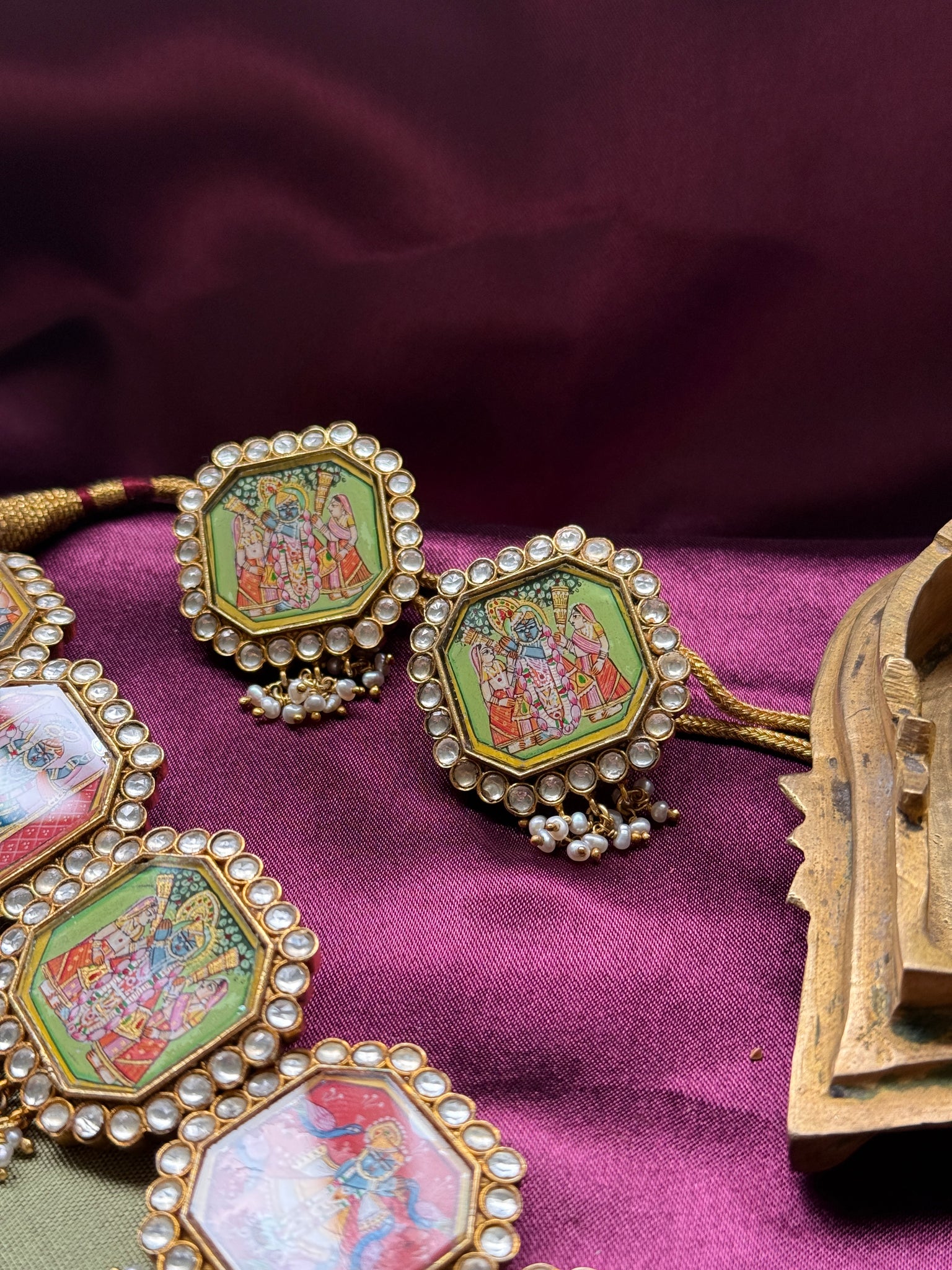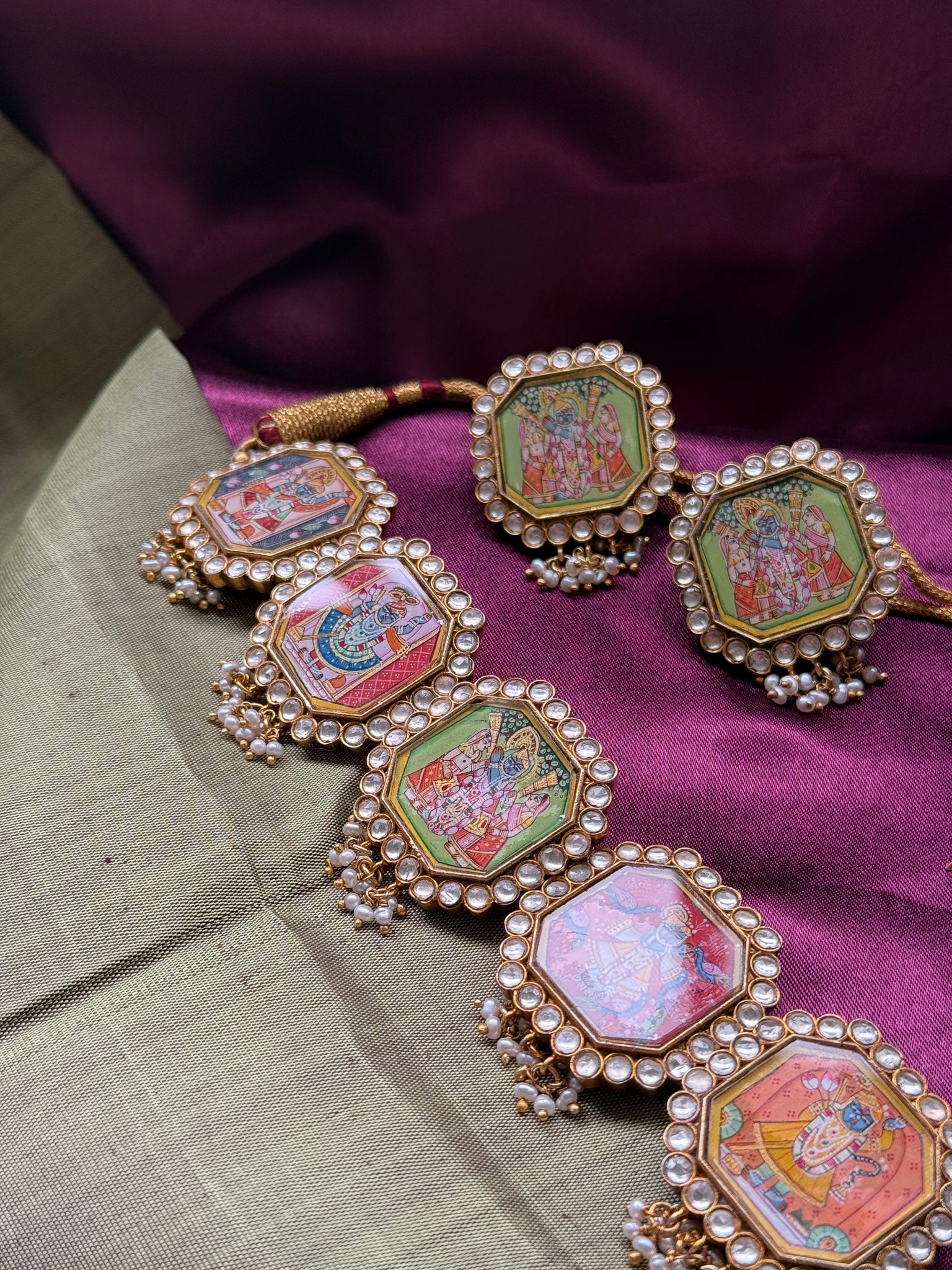One of a kind statement necklace beautifully hand painted Srinath ji motifs in 92.5silver with gold polish.