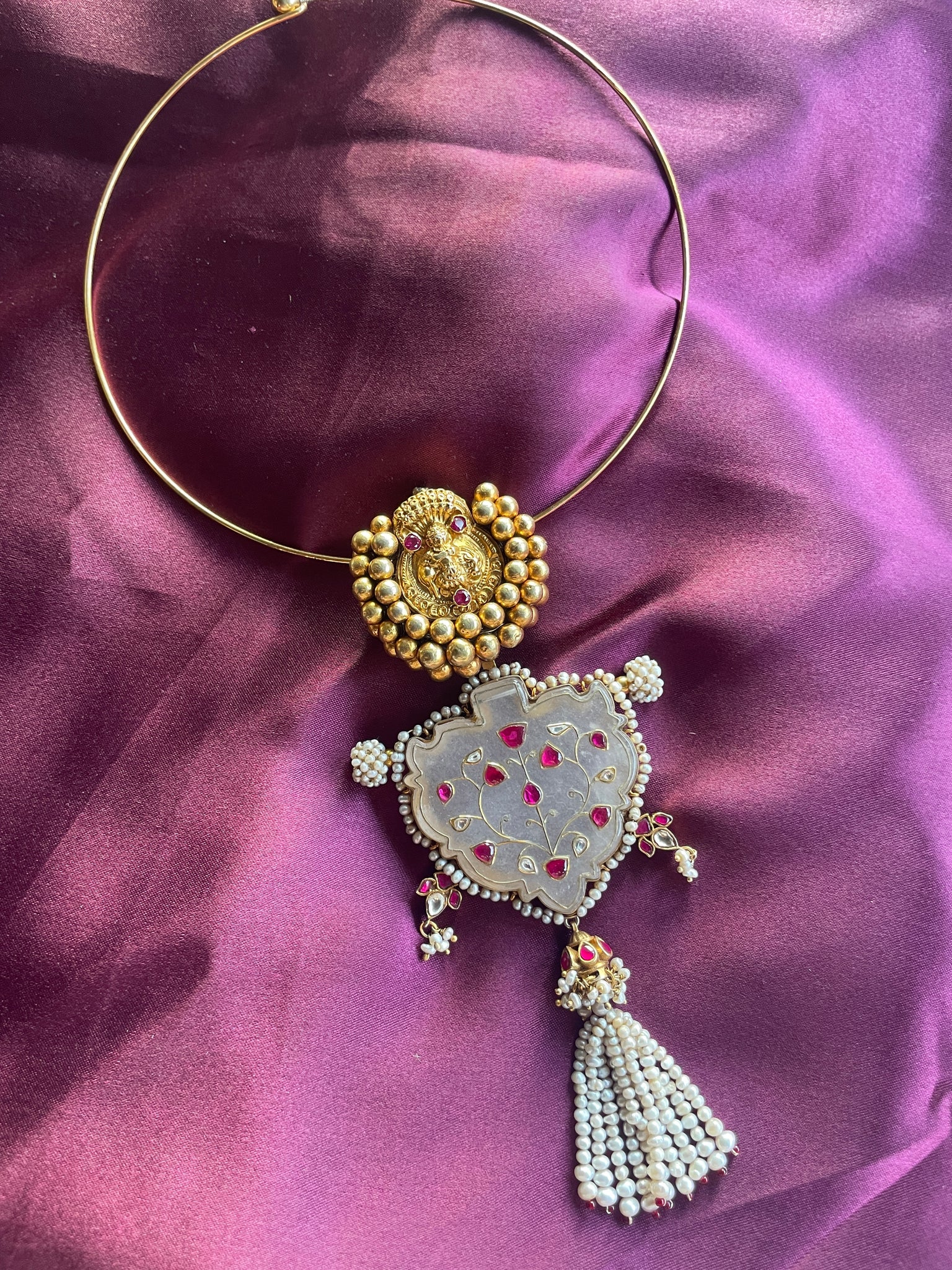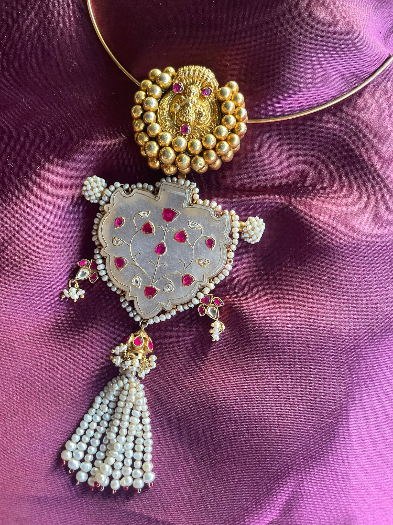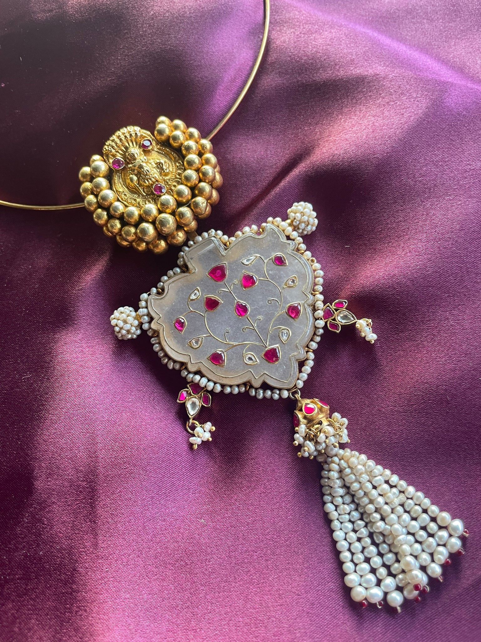 Material Used: 925 silver &gold polish,vintage Nagri pendant. Kundan stones,pearls.