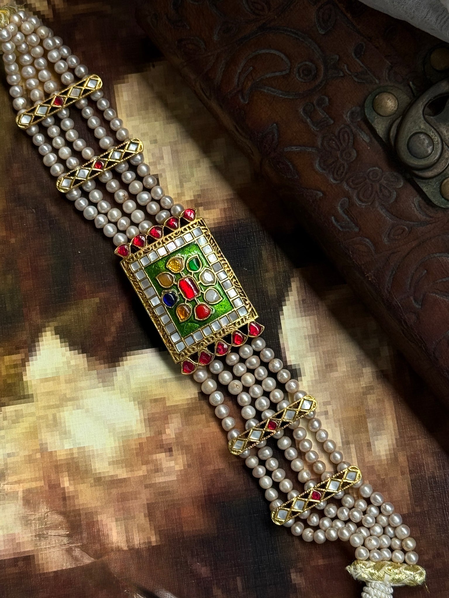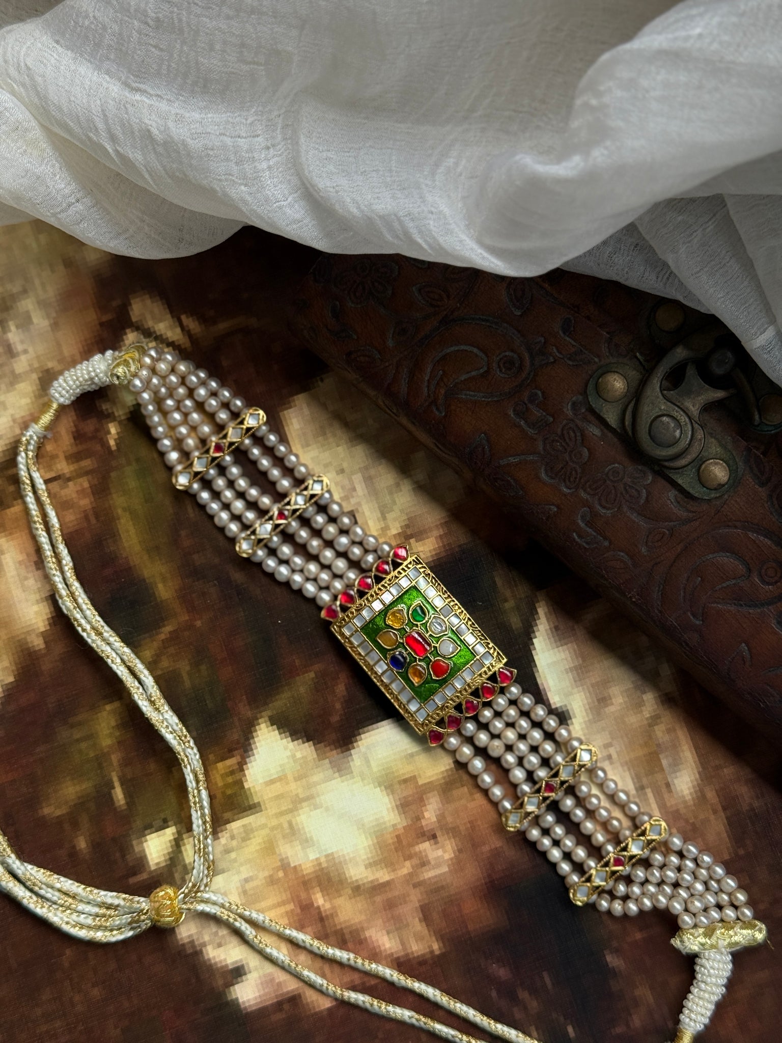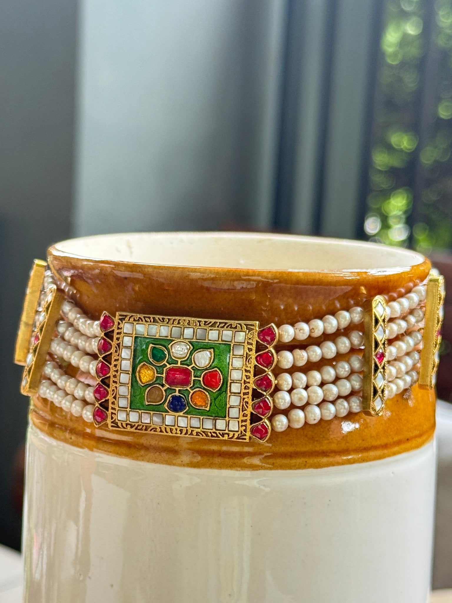This kundan pearl choker necklace is handcrafted in silver with a beautiful pendant with navratna stones flowermotif and mother of pearl stones. A versatile piece that is made by our master artisan ,from our newest of the festive kundan collection for the year 2025.
