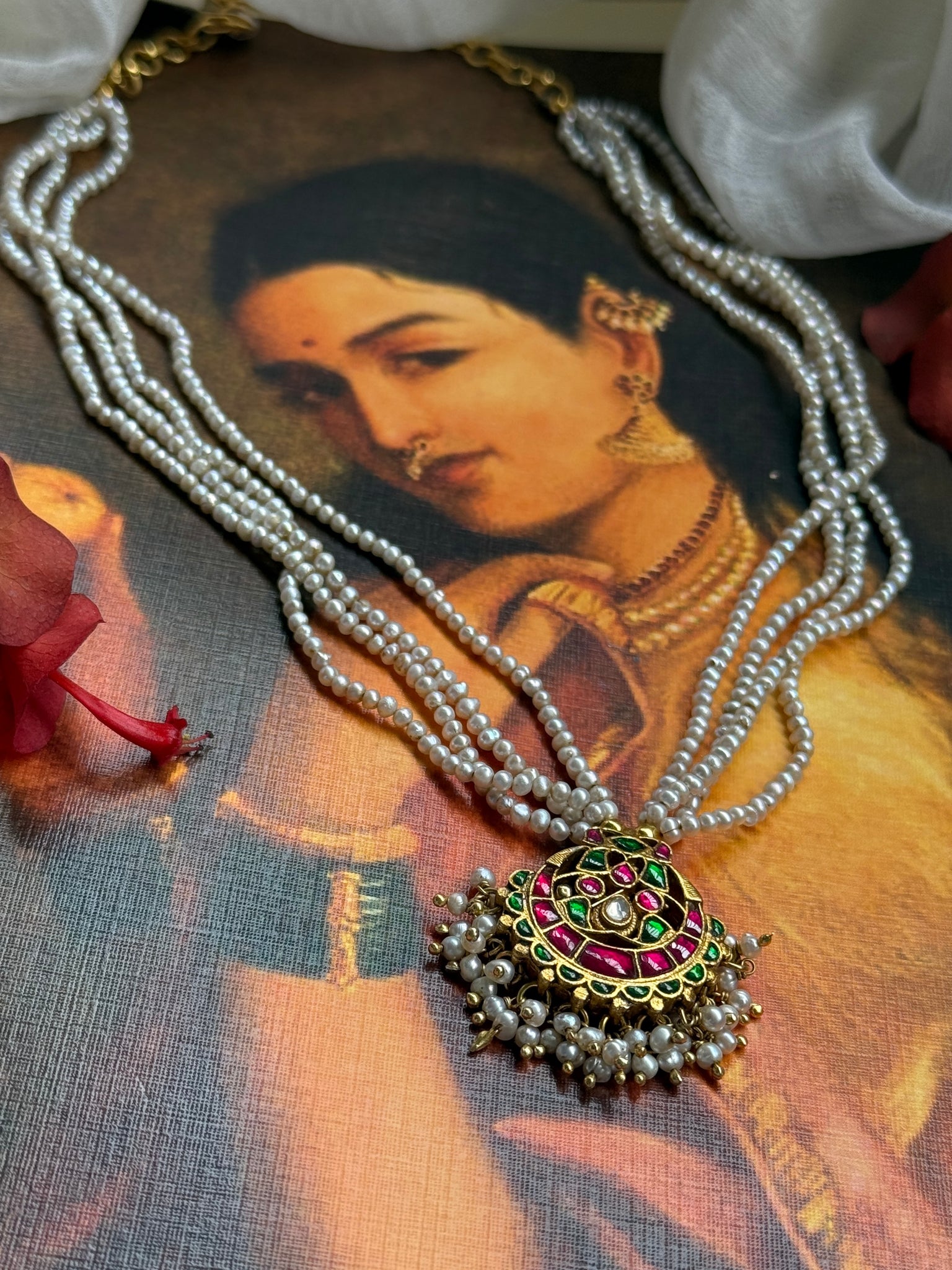 This pearl bunch necklace is handcrafted in silver with a beautiful kundan motif pendant and strands of pearls .A versatile piece that is made by our master artisan for our new collection .