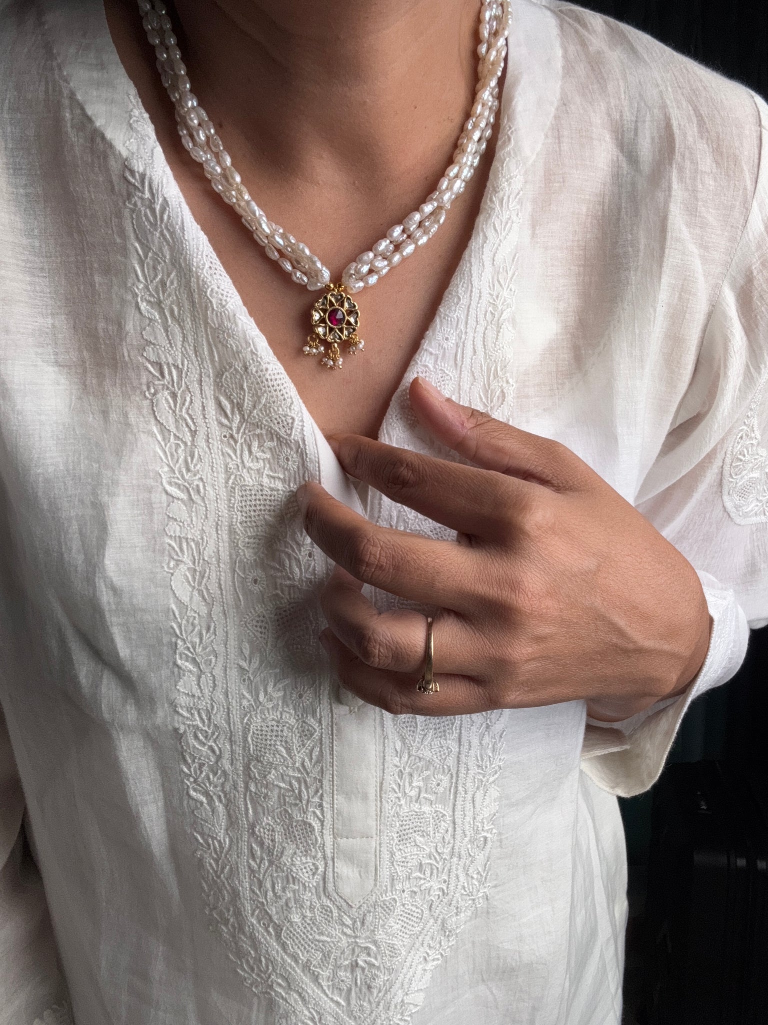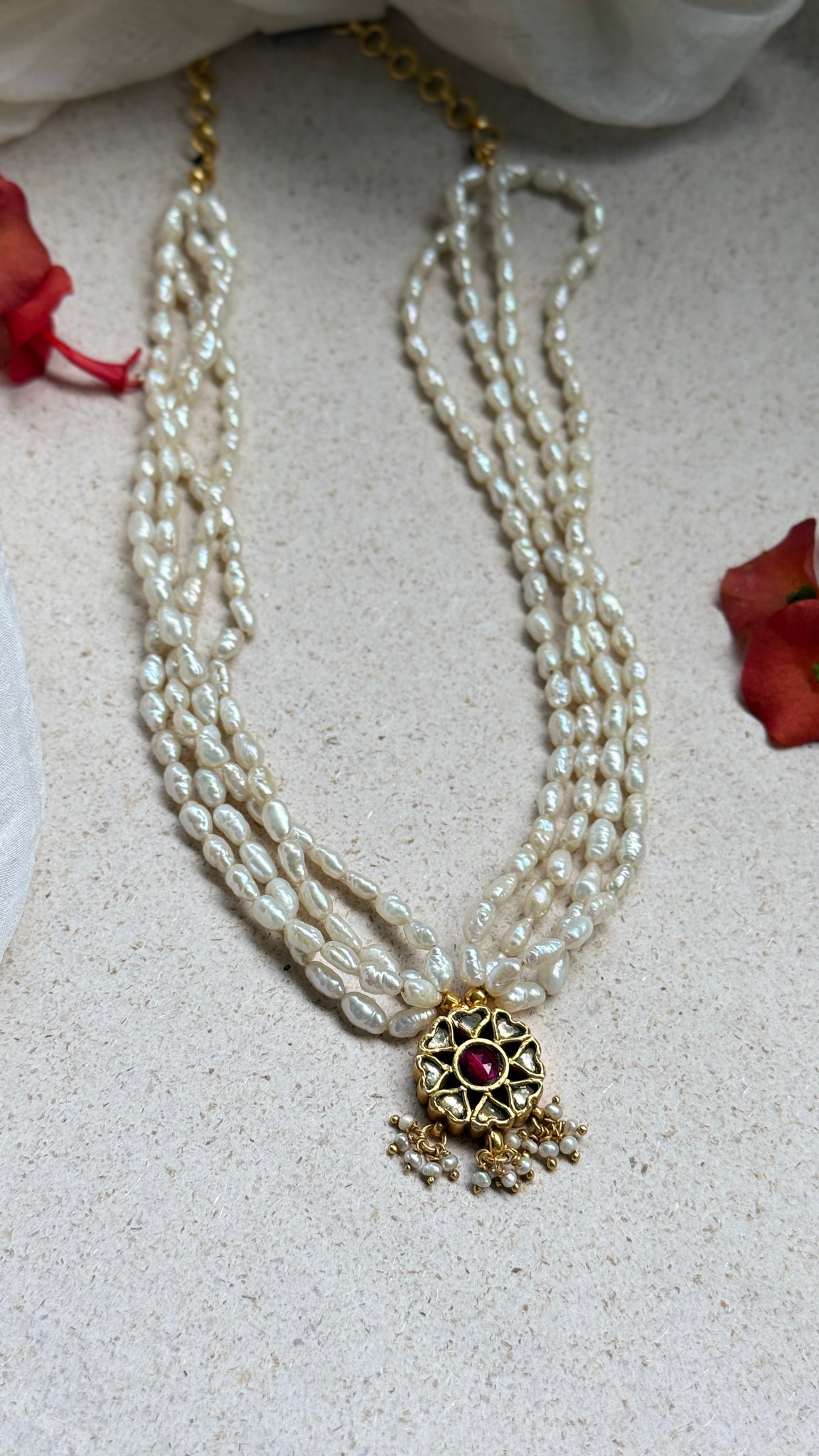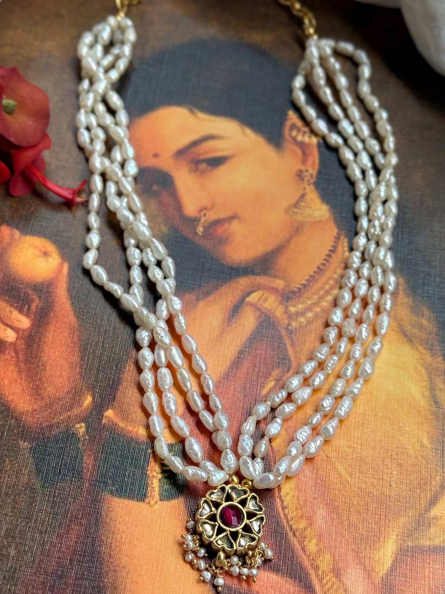 This pearl bunch necklace is handcrafted in silver with a beautiful kundan motif pendant and strands of pearls .A versatile piece that is made by our master artisan for our new collection .