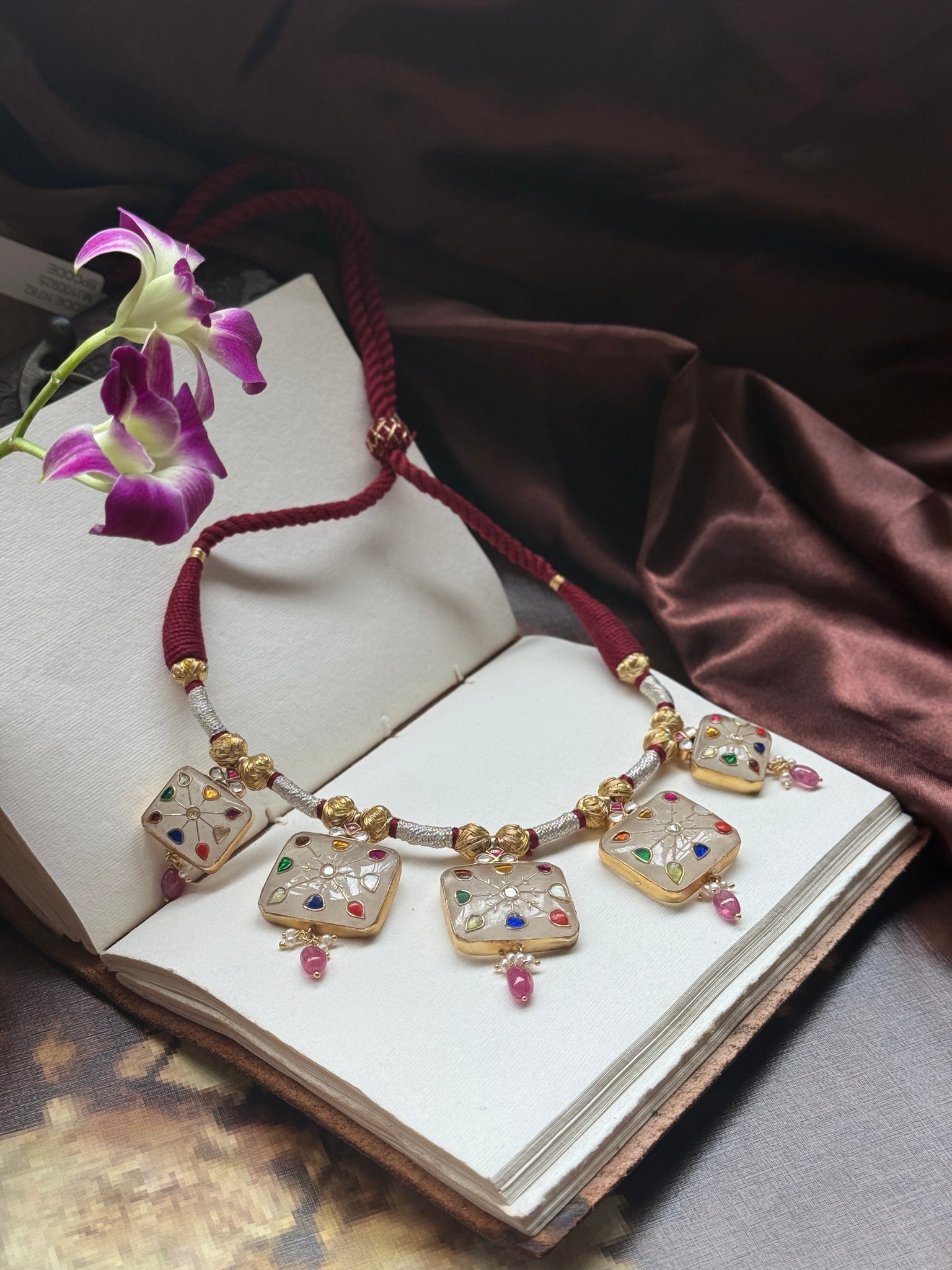 This necklace is handcrafted in silver with beautiful inlay work of navratna stones on onyx with thread work ,this necklace is called takhti necklace. This necklace comes with a traditional Indian dori.A versatile piece that is made by our master artisan for our new collection and also our favorite piece.
