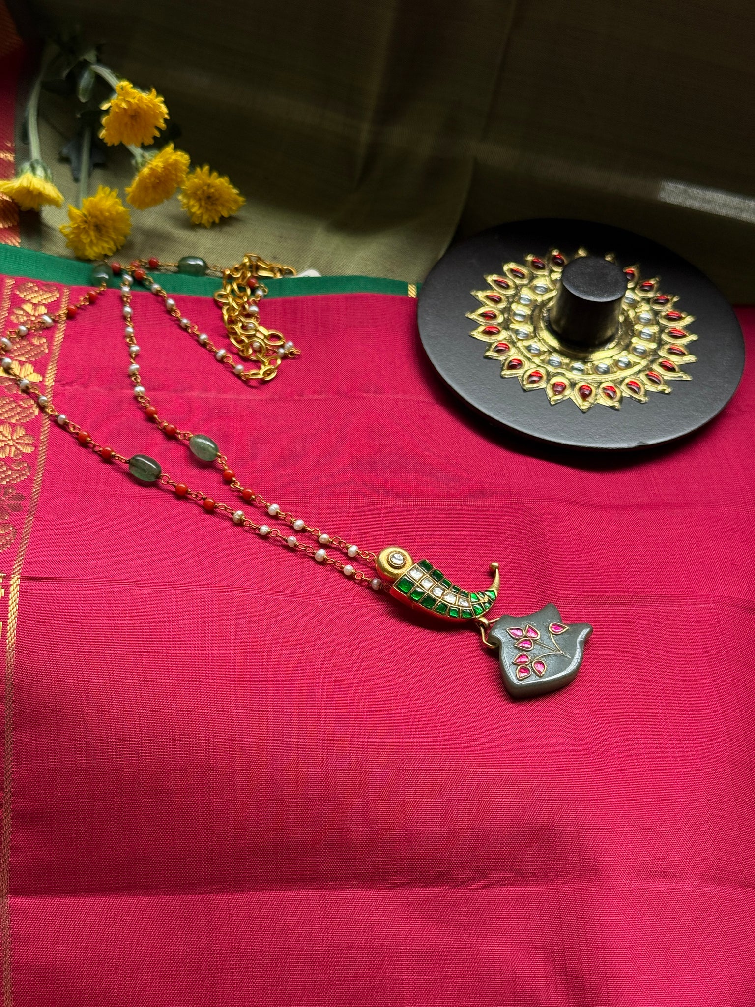 One of a kind pendant neck piece with carved aventurine stone with claw pendant inlay work pearls chain.