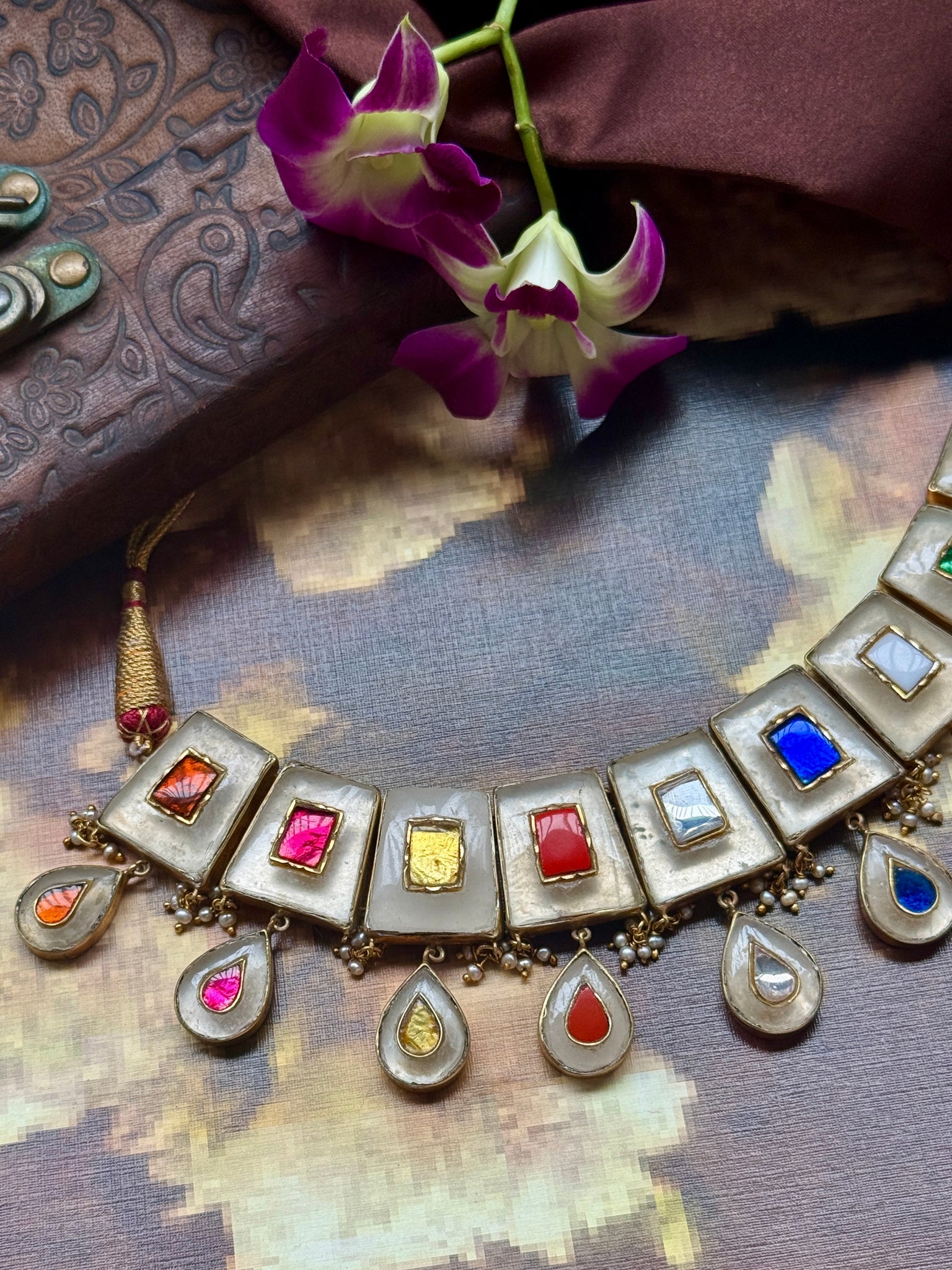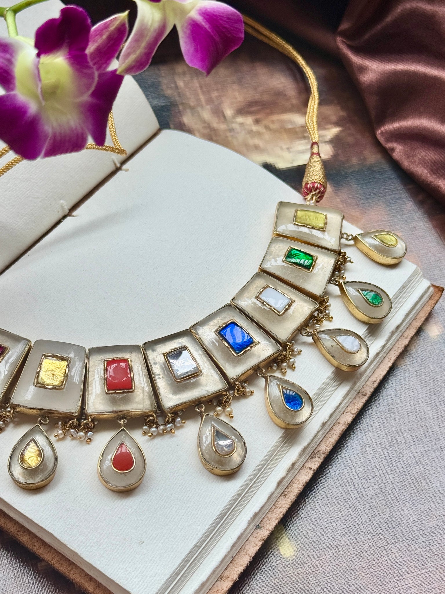 This necklace is handcrafted in silver with beautiful inlay work of navratna stones on onyx stones put together with pearl dangles . This necklace comes with a traditional Indian dori.A versatile piece that is made by our master artisan for our new collection and also a very unique piece .