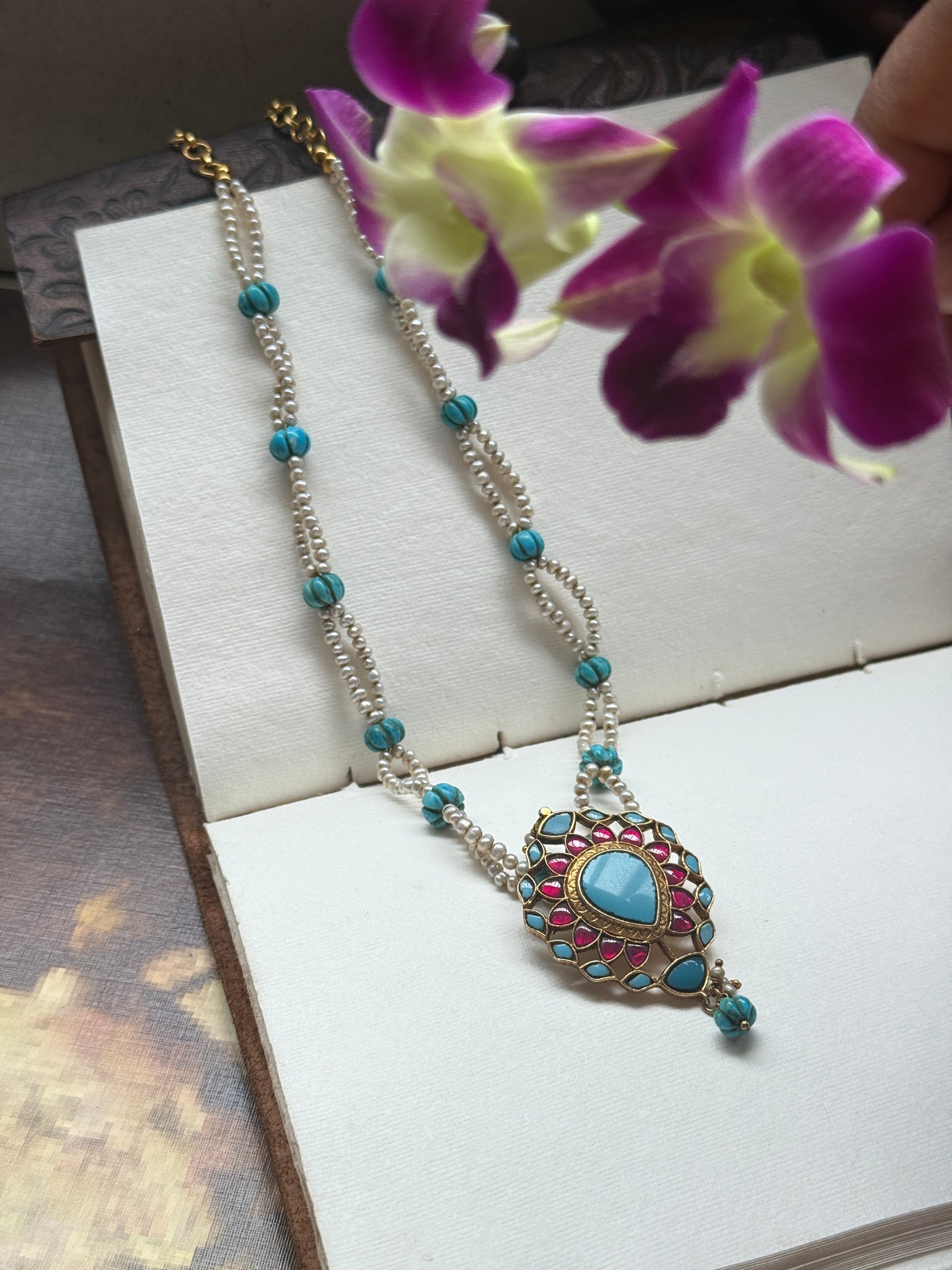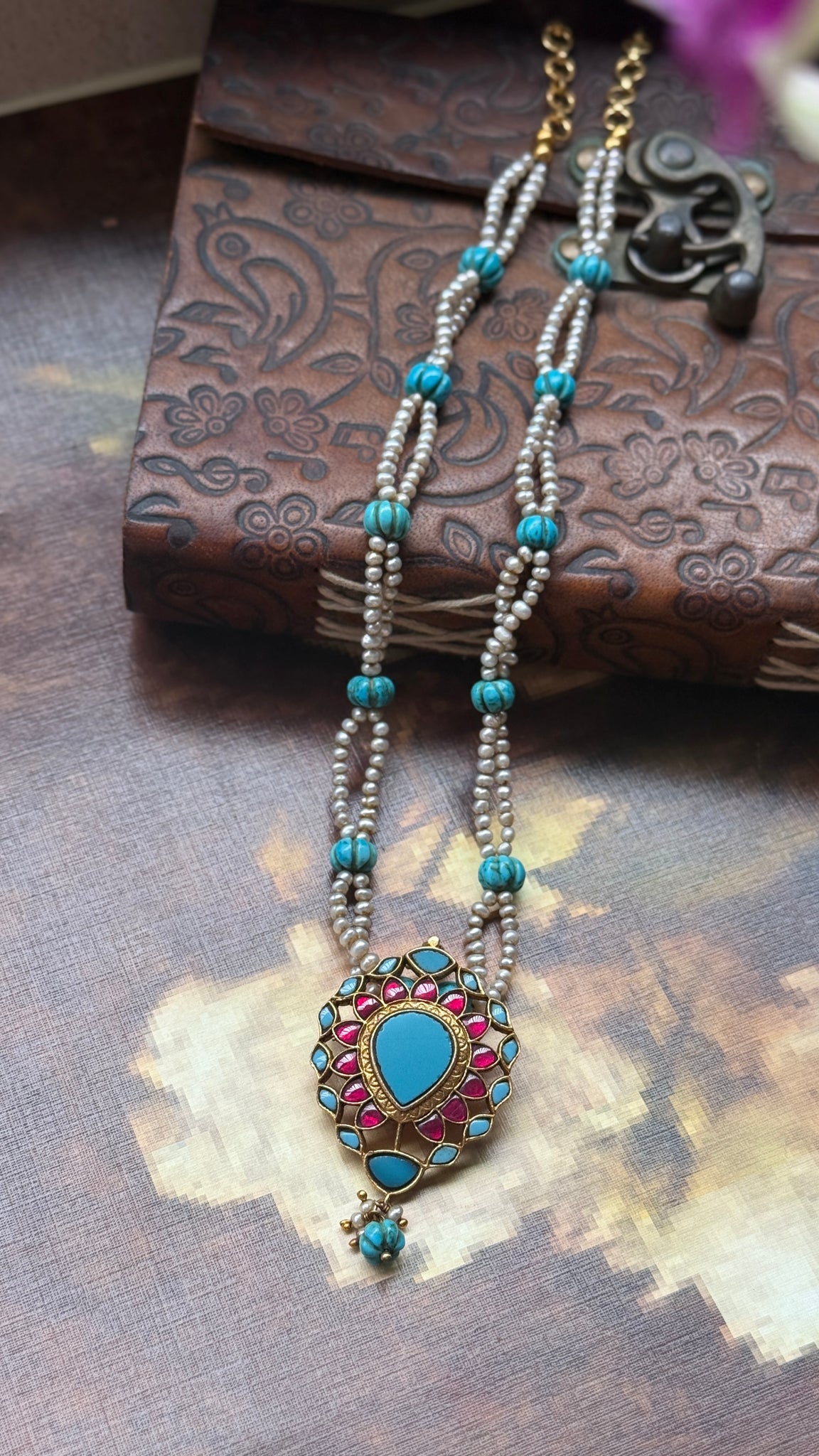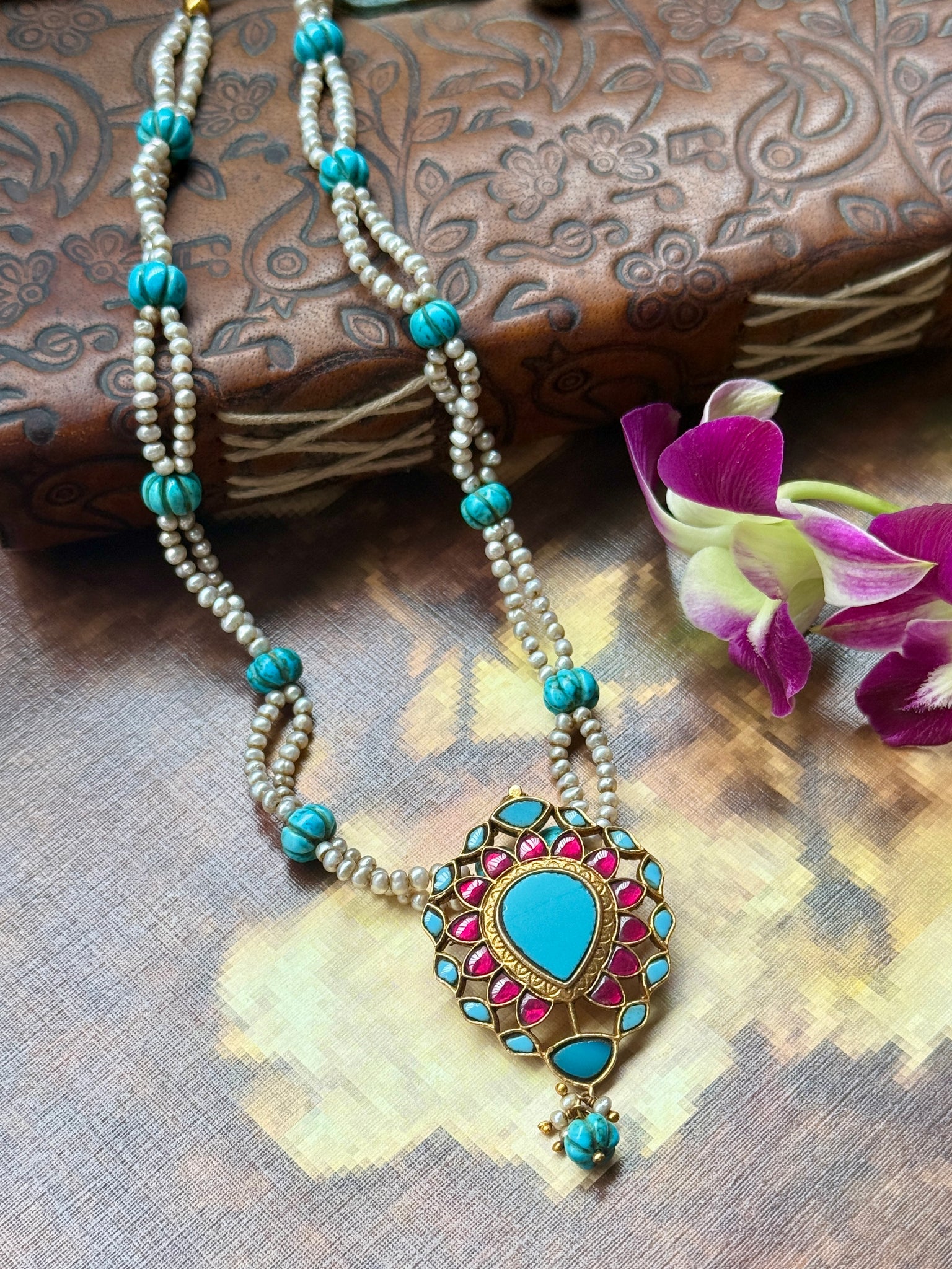 This statement necklace is handcrafted in silver 92.5 a pearl bunch and pumpkin shaped turquoise beads comes with a beautiful pendant embedded with turquoise and kundan stones .A versatile piece that is made by our master artisan for our new collection and also a very unique piece .