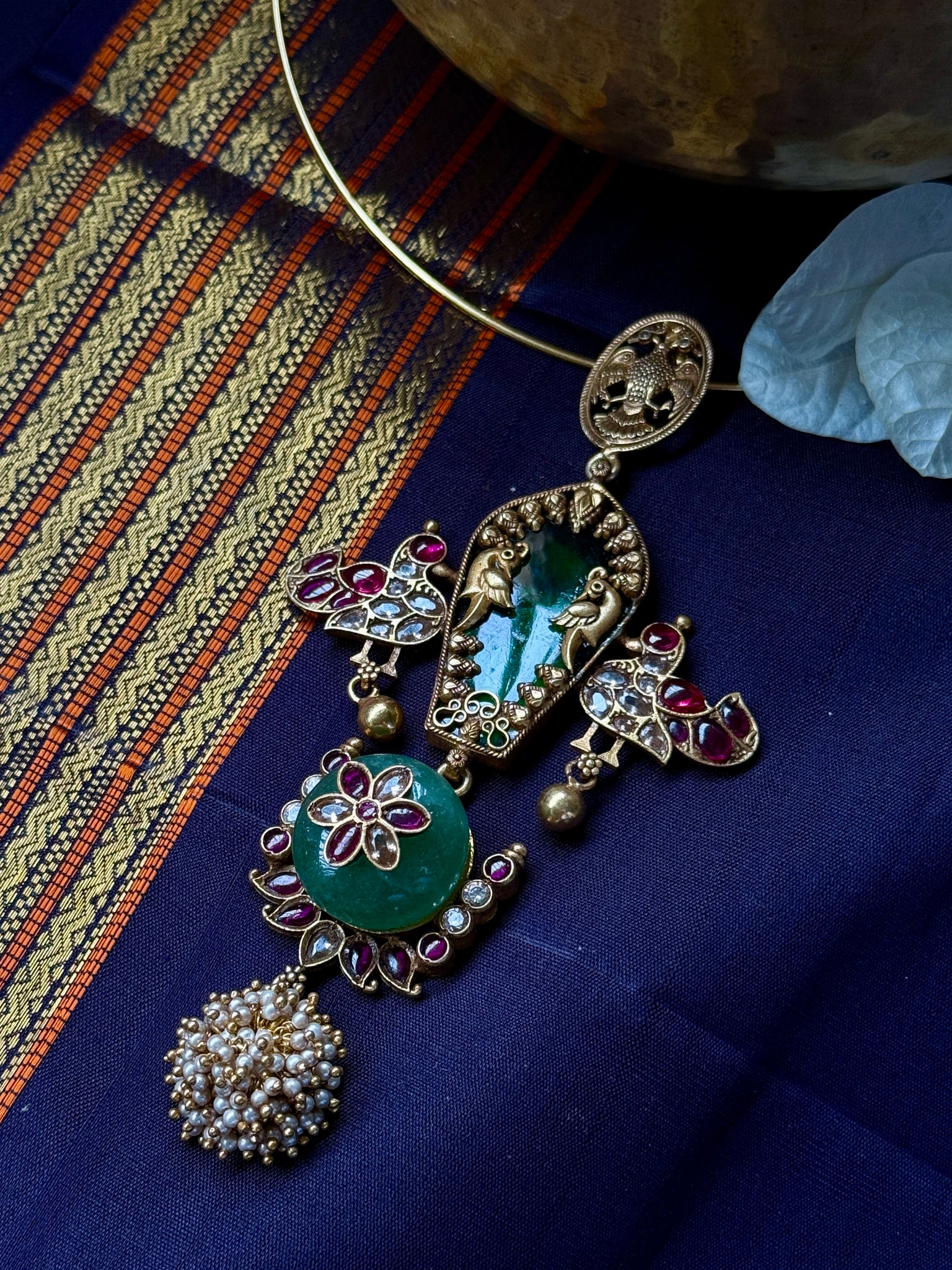 This is a one of a kind vintage neckpiece with very intricate nakshi work with gandaberunda and peacock pendant, emerald,pearl bunch,Kundan stones with inlay work handcrafted in silver 925, gold polish made by our master artisan. A personal favourite collection .