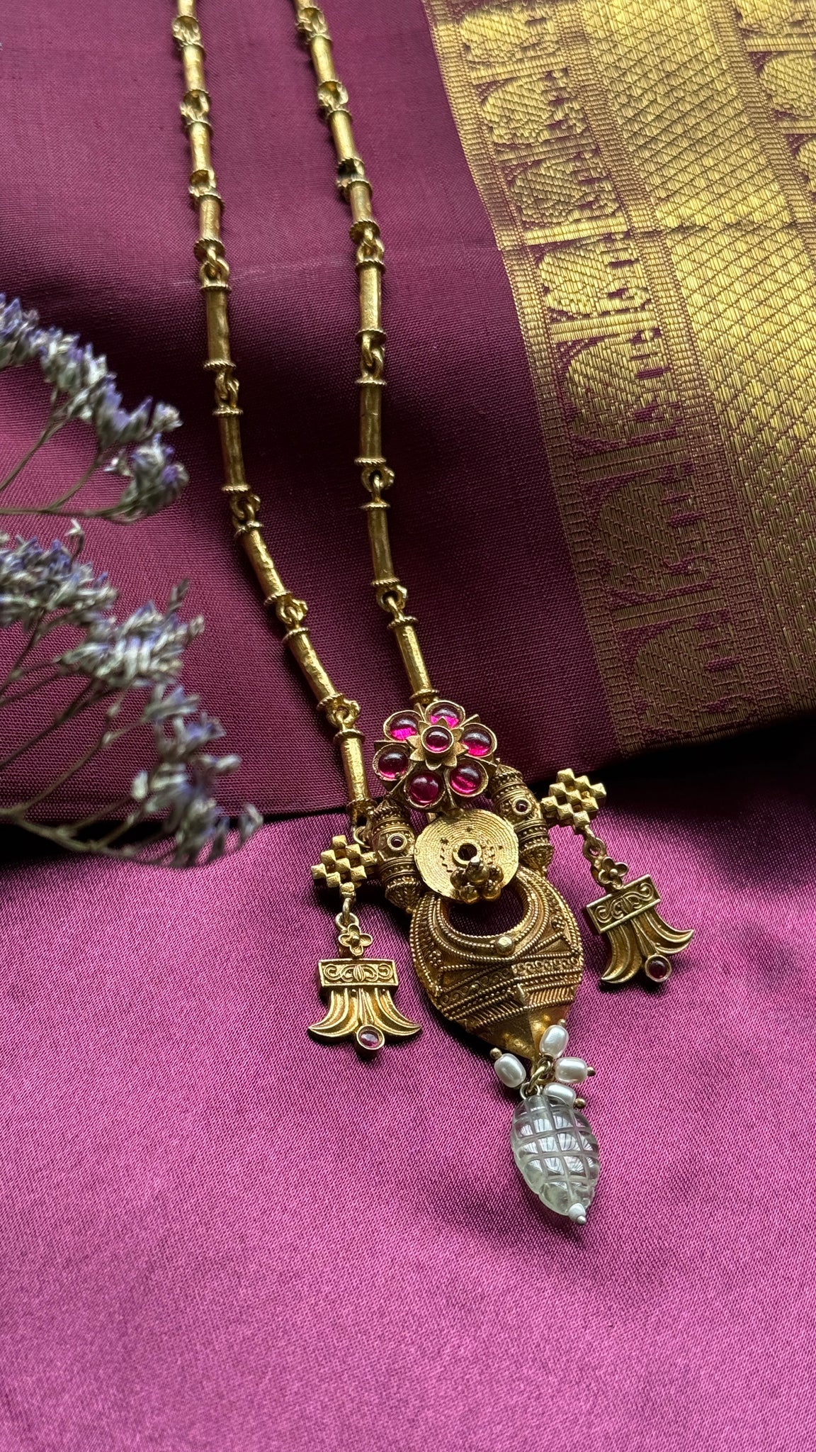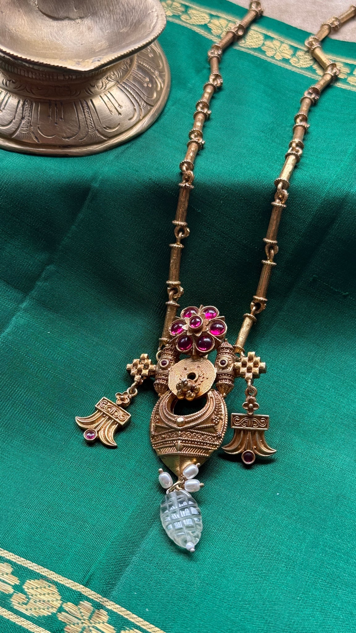 This is a vintage style inspired neckpiece with very intricate nakshi work in silver with beatifully crafted pendant. Made in silver 925 and gold polished by our master artisans . A classic collection .