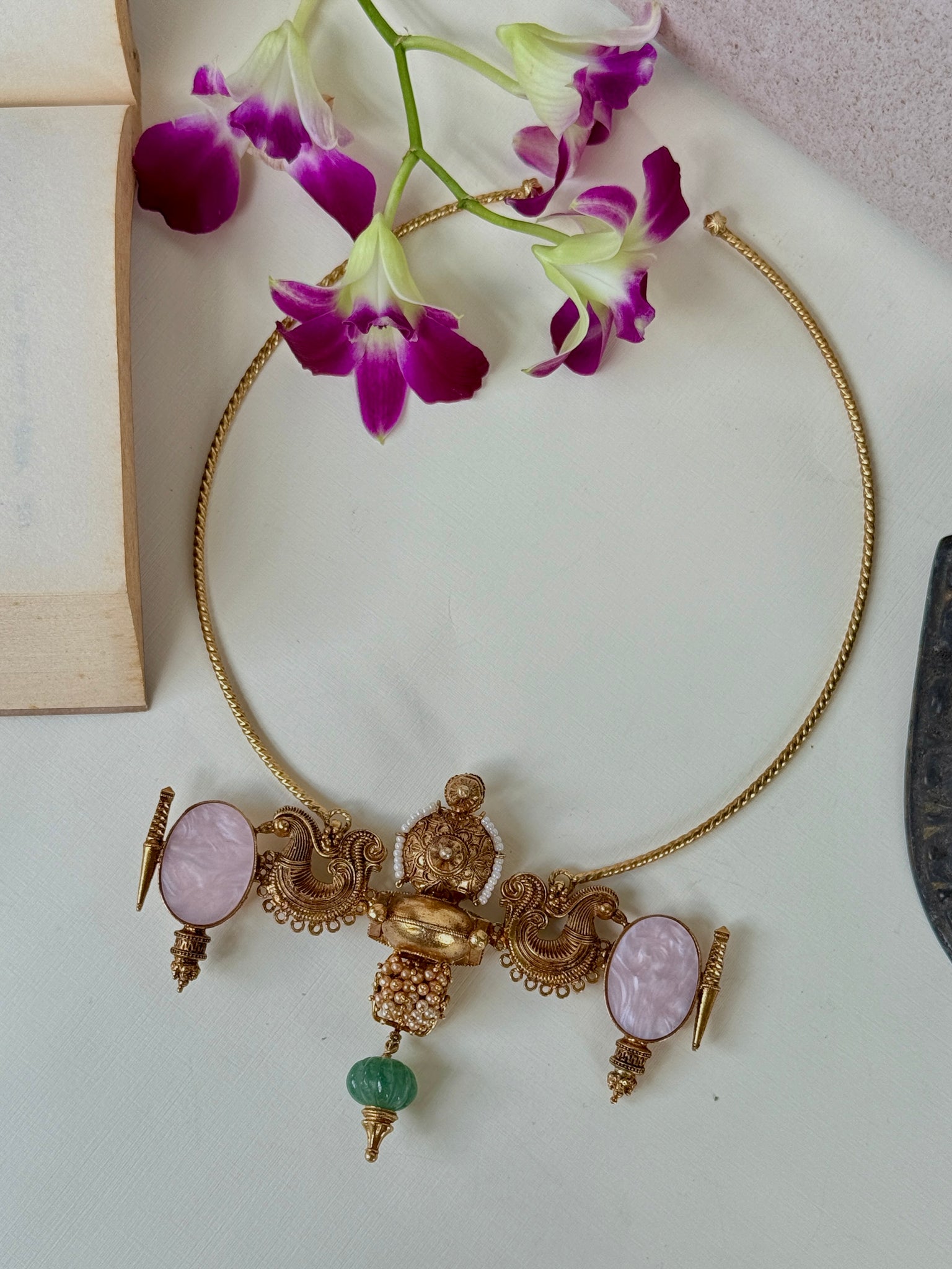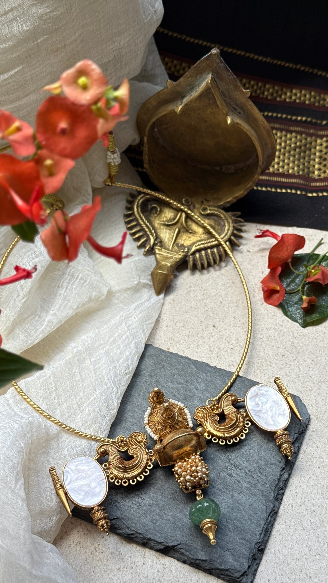 This statement necklace is made with embedded mother of pearl and emerald featuring a statement vintage style pendant inspired from the ancient jewelry pieces . A versatile piece that is made by our master artisan for our vintage collection.