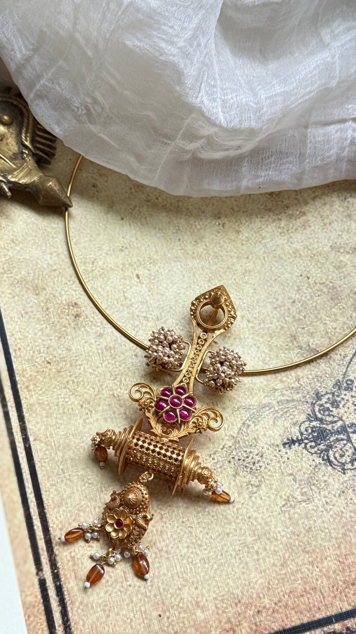 This statement festive necklace is made with pure 92.5 silver .Featuring vintage style nakshi work pendant featuring weaving work, kundan stones and pearls bunch, inspired from the architecture of ancient temples .A versatile piece that is made by our master artisan for our new festive collection.