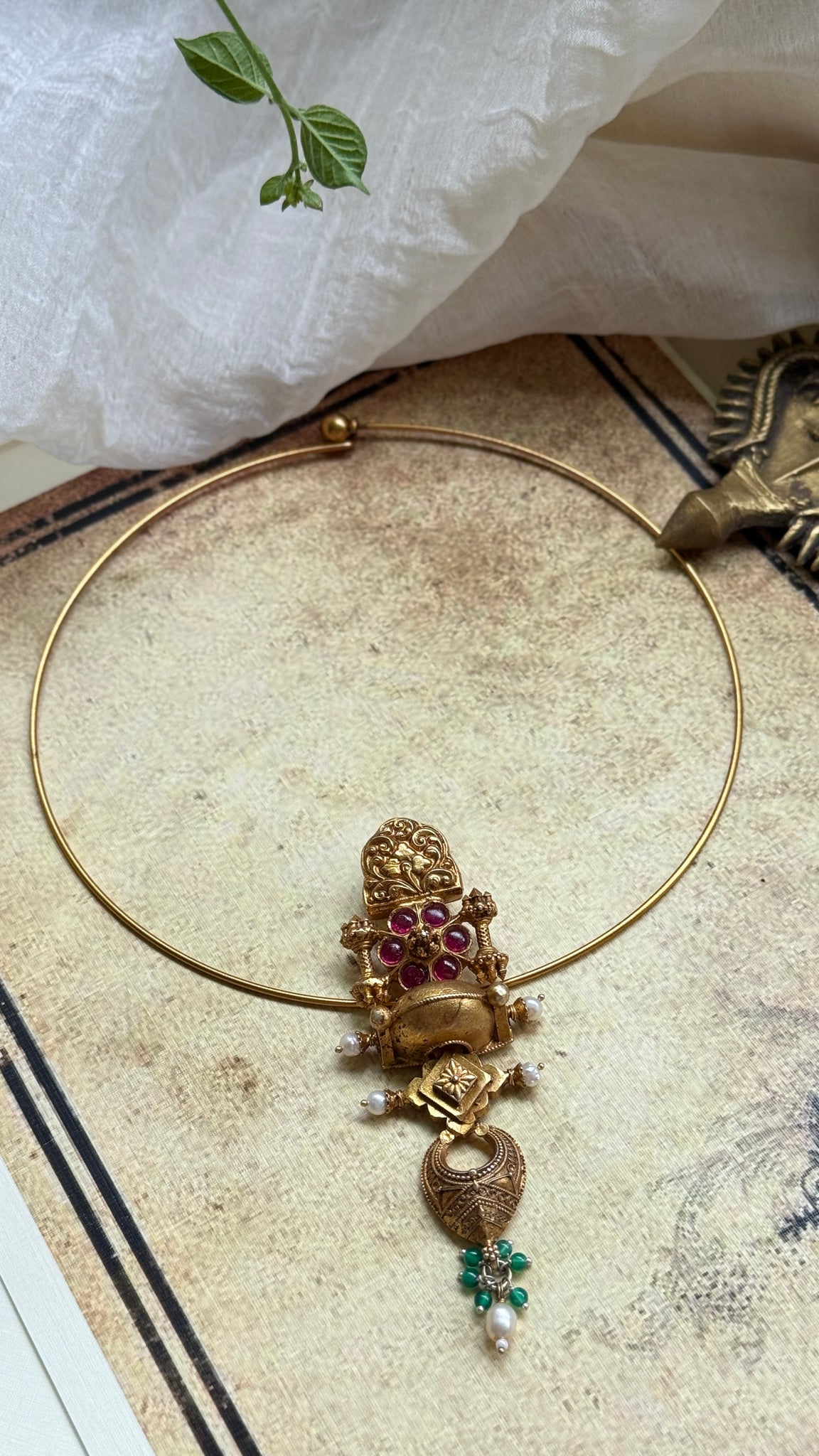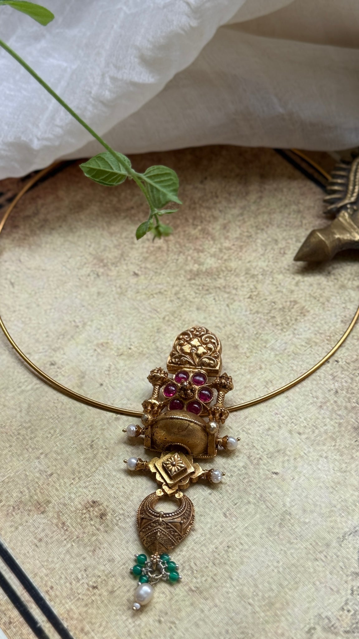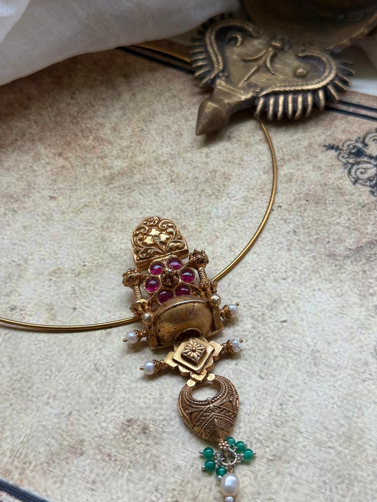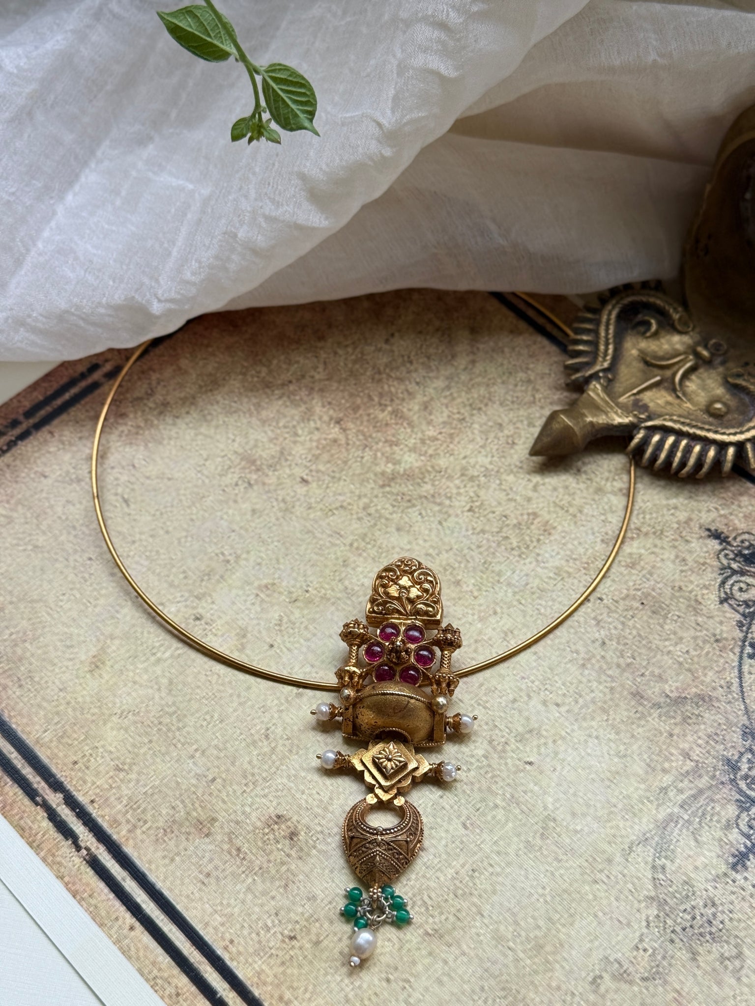 This statement festive hasli necklace is made with pure 92.5 silver .Featuring intricate nakshi work pendant with kundan stones and pearls, inspired from the vintage jewellery.A versatile piece that is made by our master artisan for our new festive collection.
