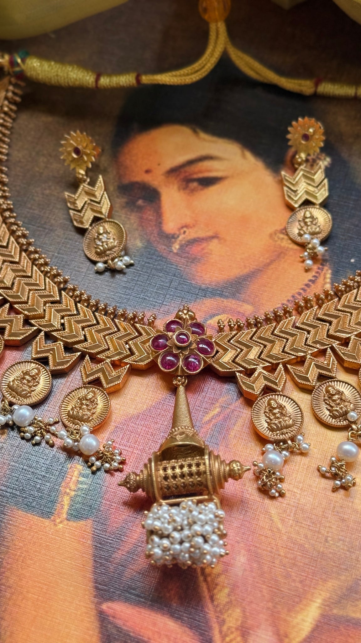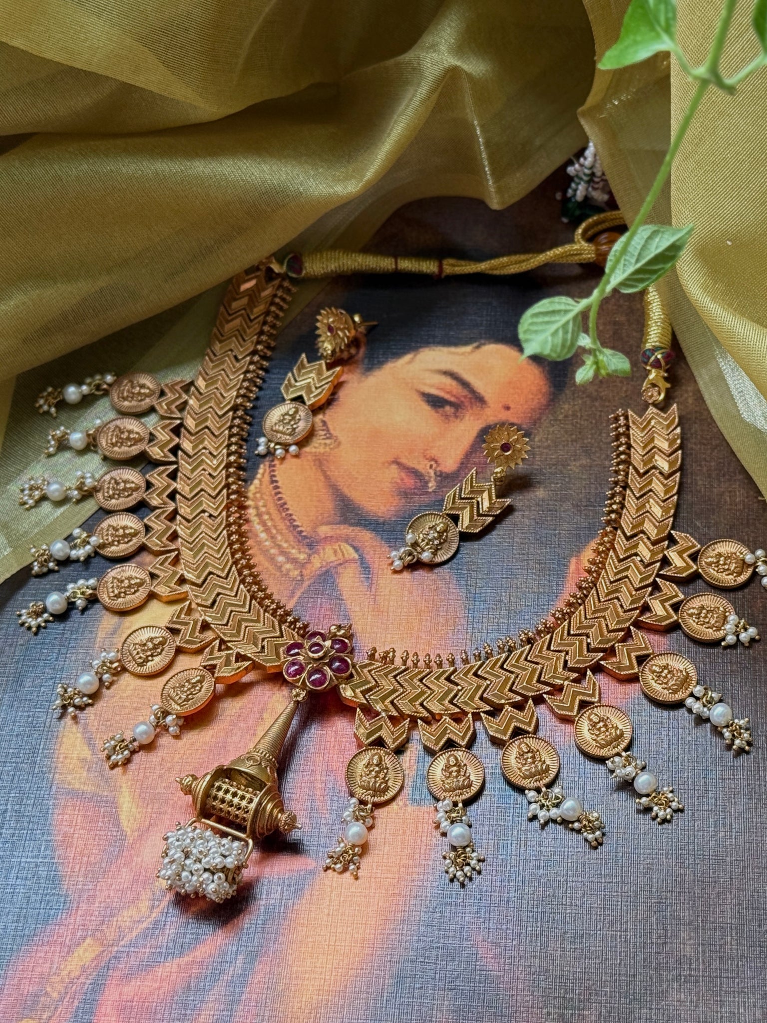 This statement festive necklace is made with pure 92.5 silver .Featuring vintage style nakshi work with kundan stones and traditional kasu pendants.A versatile piece that is made by our master artisan for our new festive collection,comes with pair of earrings.