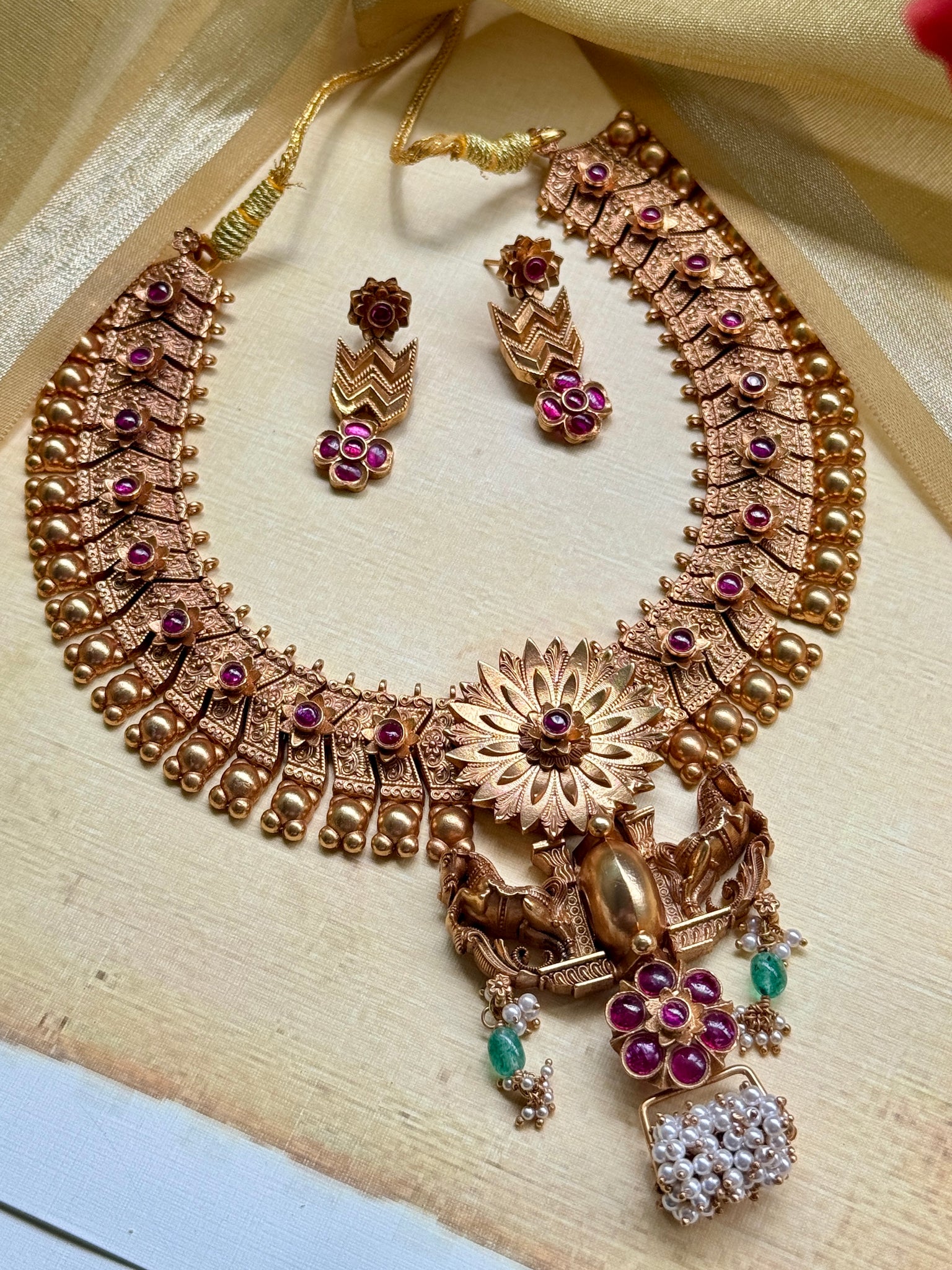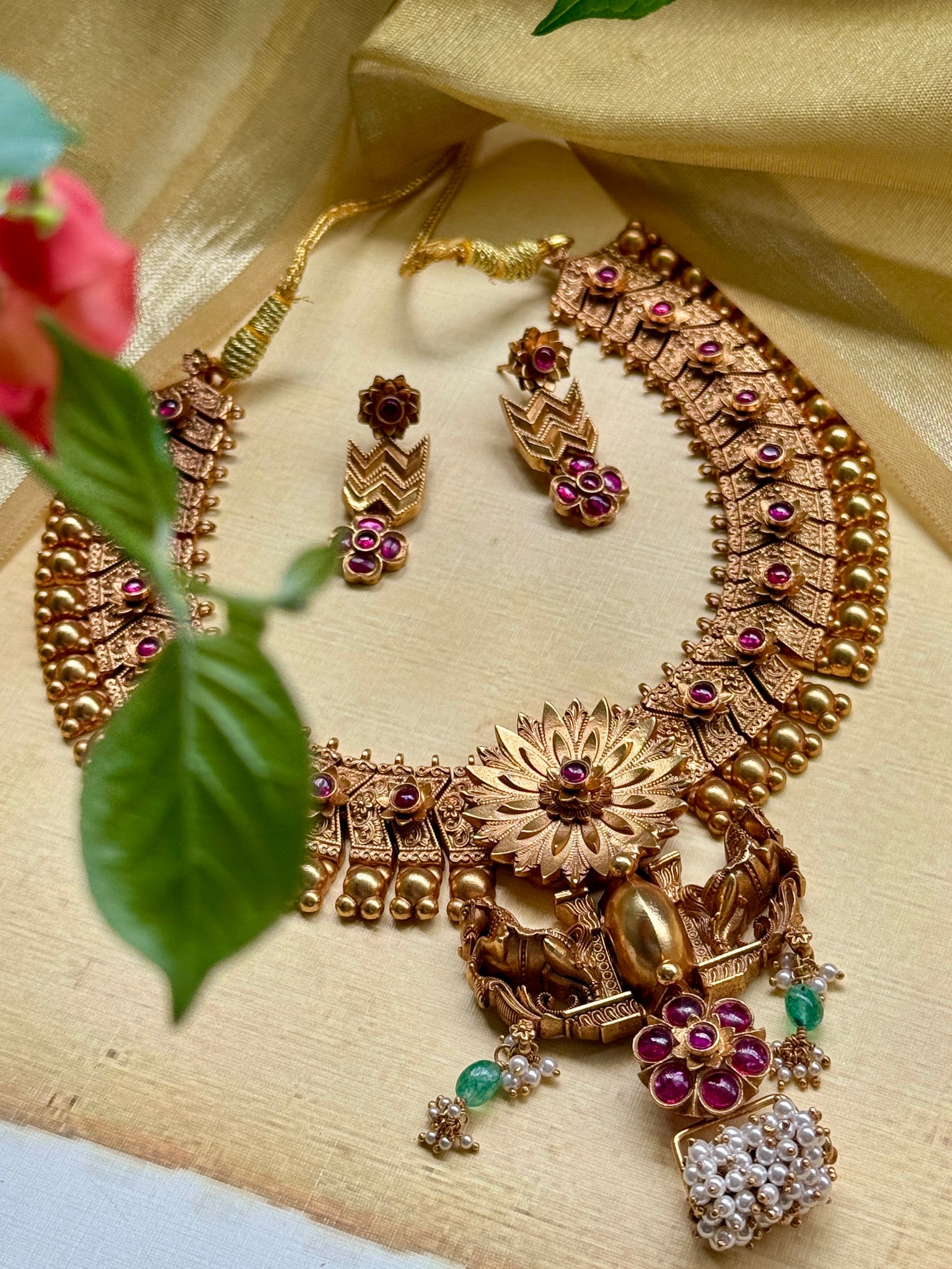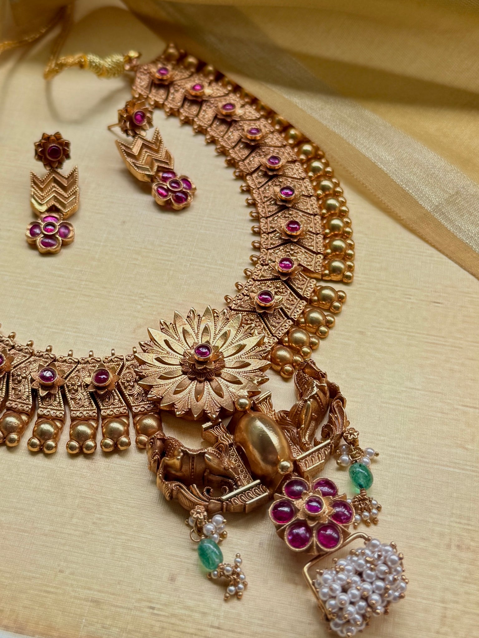 This statement festive necklace is made with pure 92.5 silver .Featuring vintage style nakshi work with kundan stones and beautiful flower,horse motifs inspired from the architecture of ancient temples .A versatile piece that is made by our master artisan for our new festive collection,comes with pair of earrings.