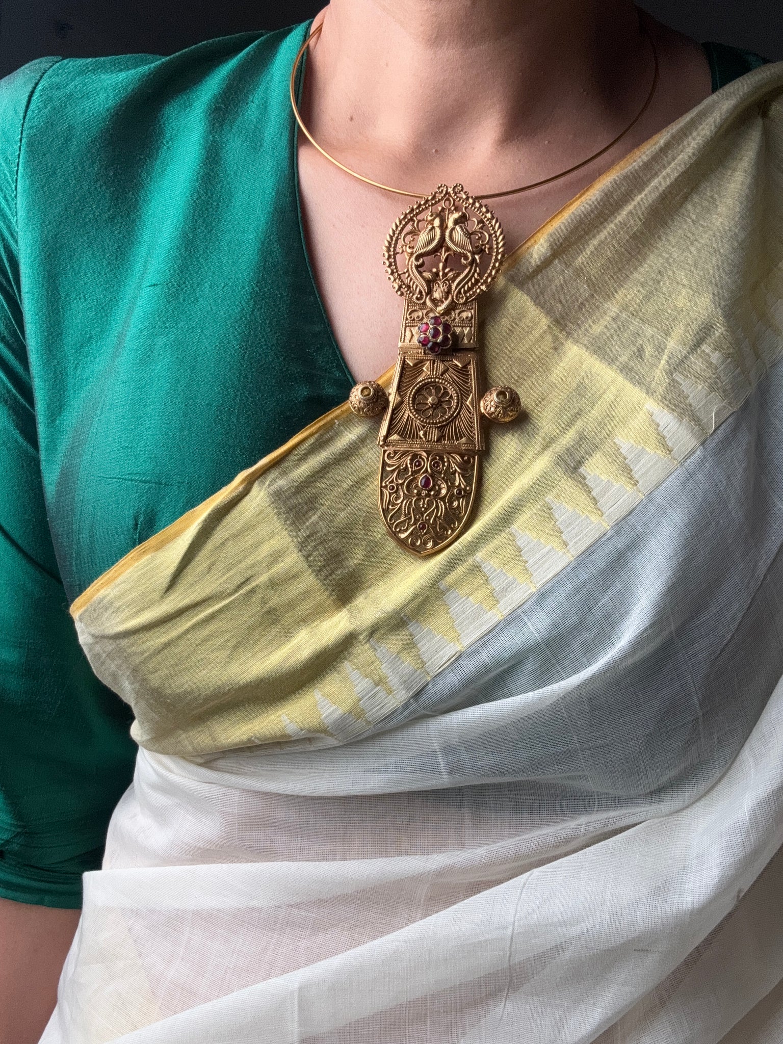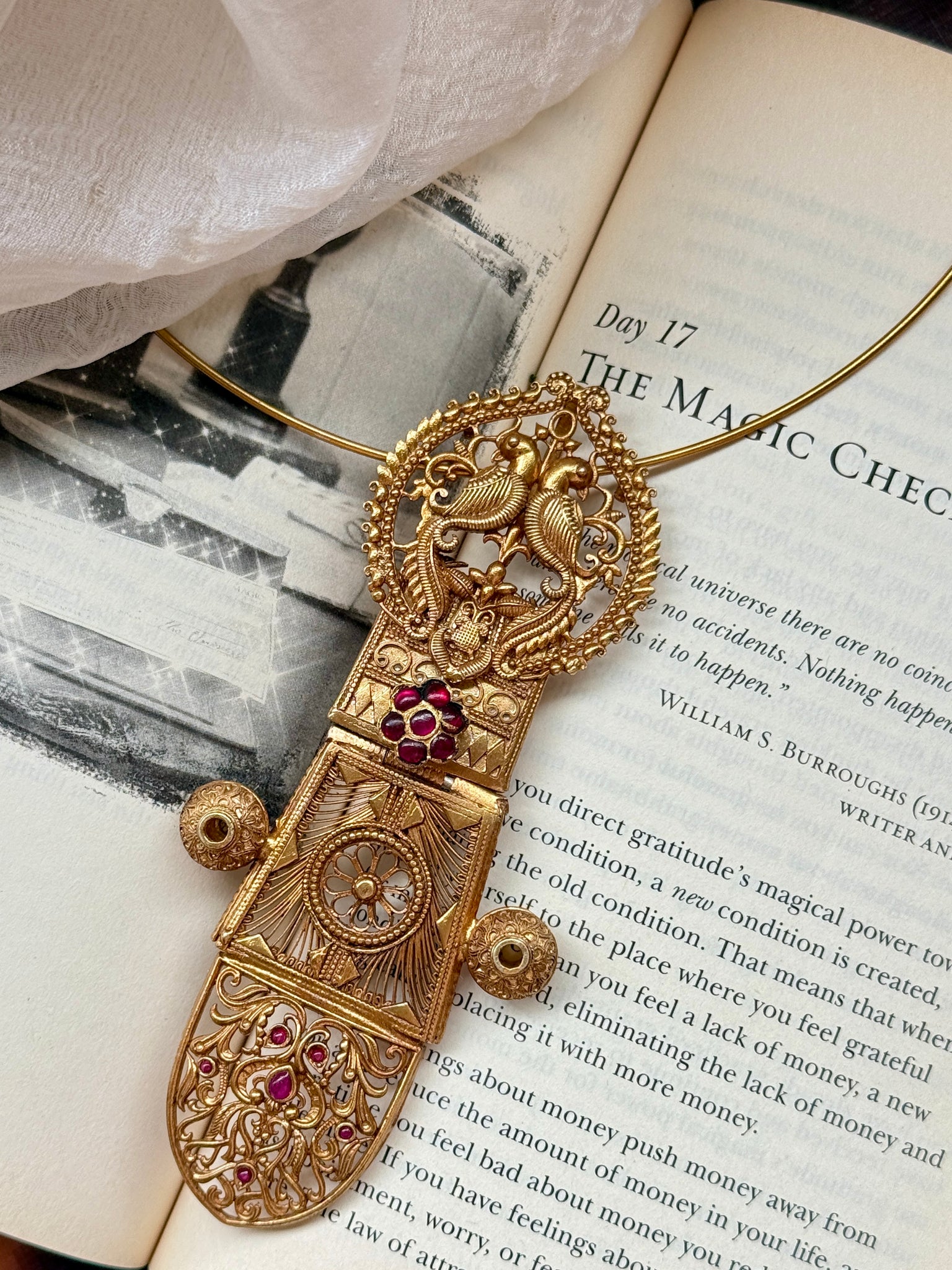 This one of a kind pendant with hasli is handcrafted in silver with a vintage pendant and has intricate carvings on Kundan stones . A versatile piece that is unique and gives a contemporary look.This particular necklace from our recent festive collection.