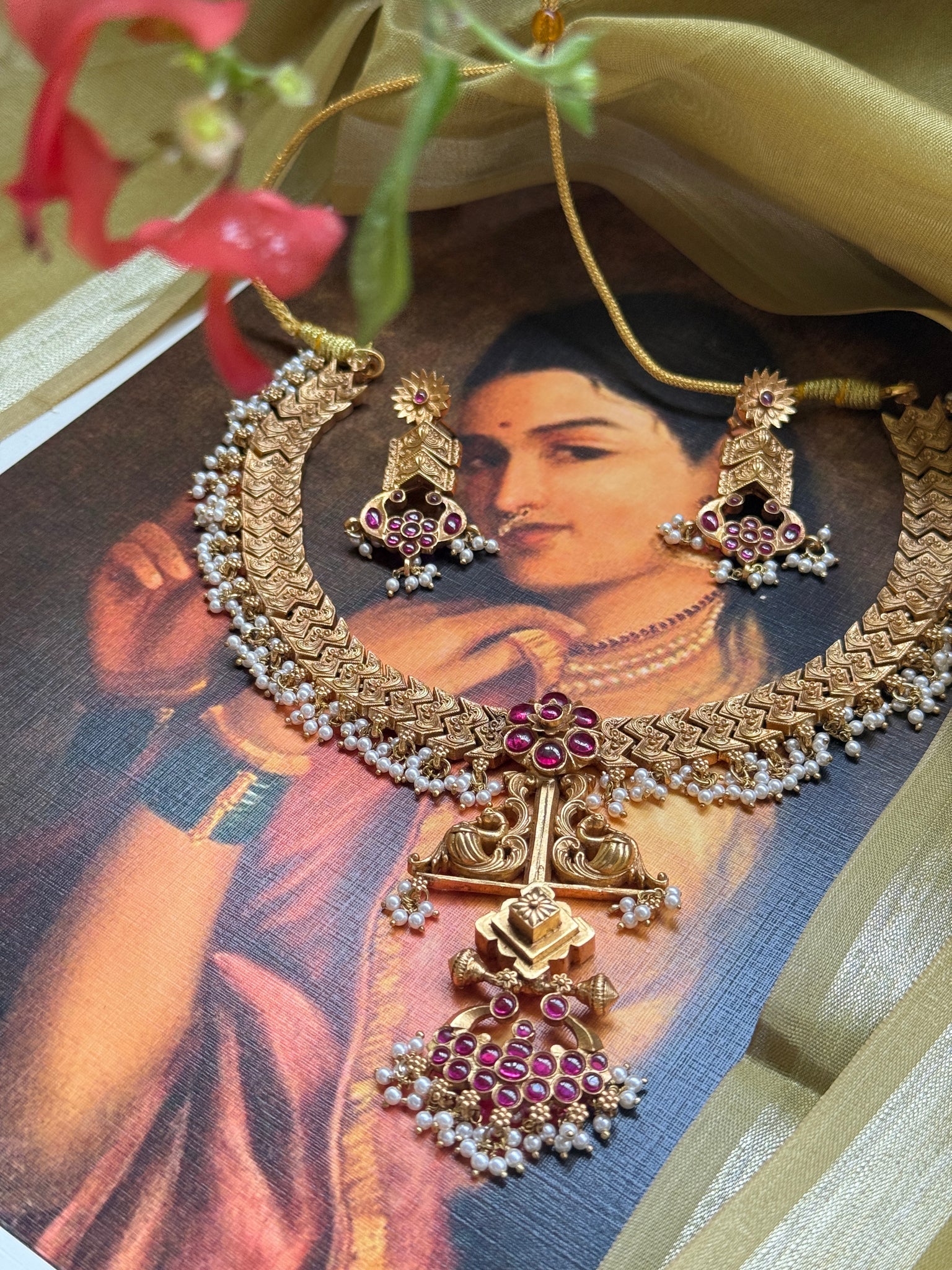 This statement festive necklace set is made with pure 92.5 silver. Featuring vintage style nakshi work with pearl danglers inspired from the ancient jewellery .Versatile piece that is made by our master artisan for our new festive collection,comes with a beautiful pair of earrings.