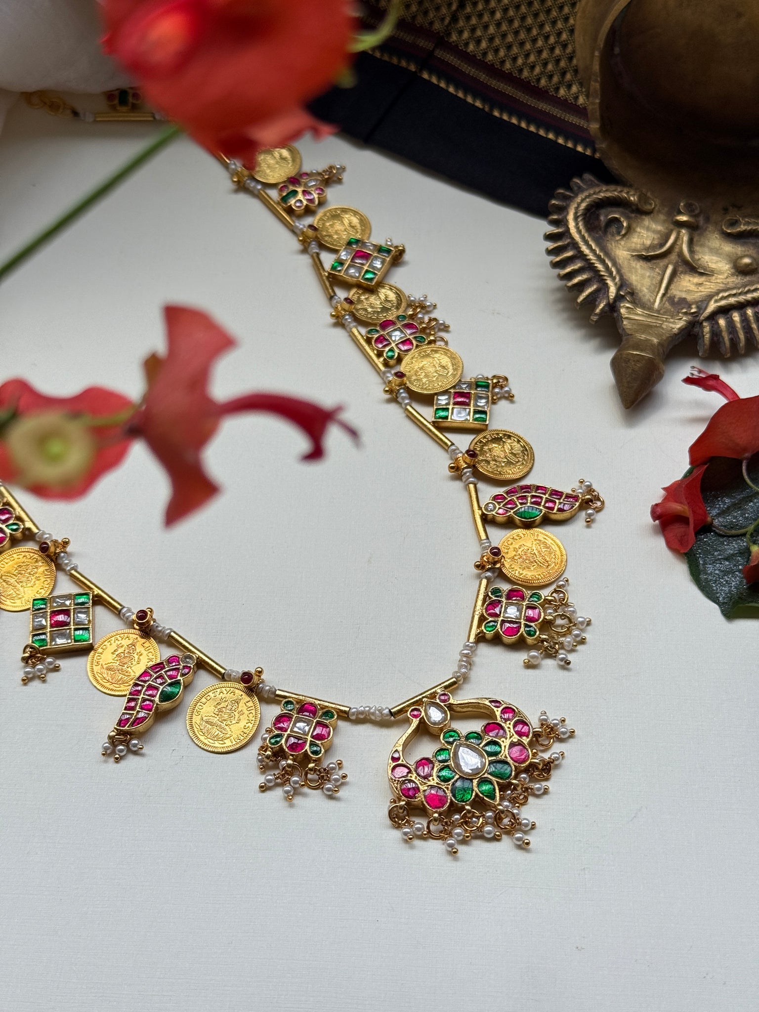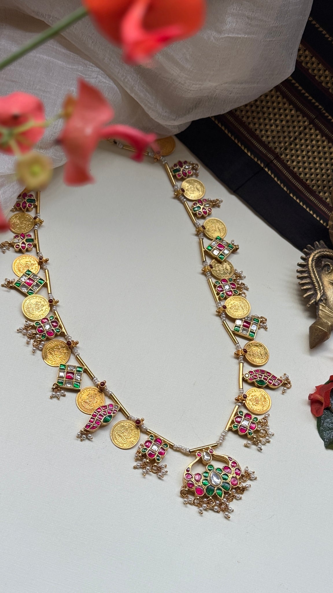 This beautiful necklace is crafted with gold coins (kasu) and features intricate pendant work adorned with kundan, and this necklace is made with 92.5 silver featuring a beautiful series of our vintage style kasu Mala with kundan pendant long necklace with gold polish. A versatile piece that is made by our master artisan for our vintage collection.