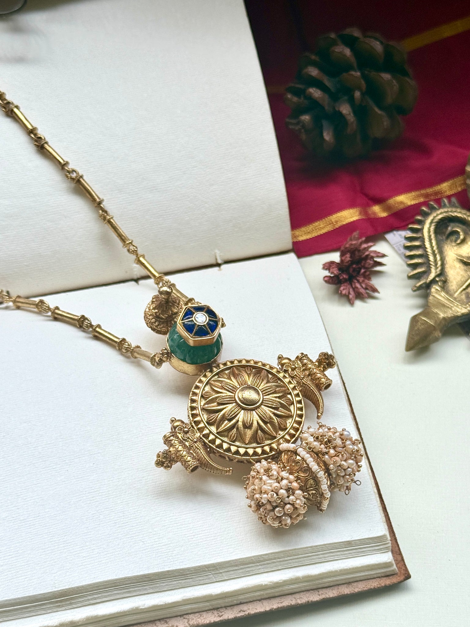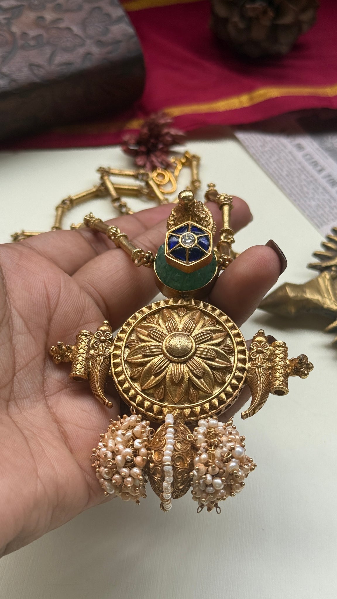 This statement necklace inspired from the vintage jewelry of our ancestors from the southern region of India is handcrafted in pure 92.5 silver with nakshi work pendant ,emerald gem stone with gold carvings ,lapis lazuli stones in the center attached to cluster of pearls below with cylindrical gold segments.A versatile piece that is made by our master artisan for our vintage collection.