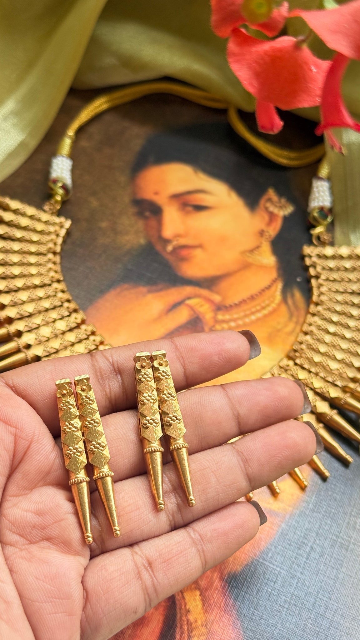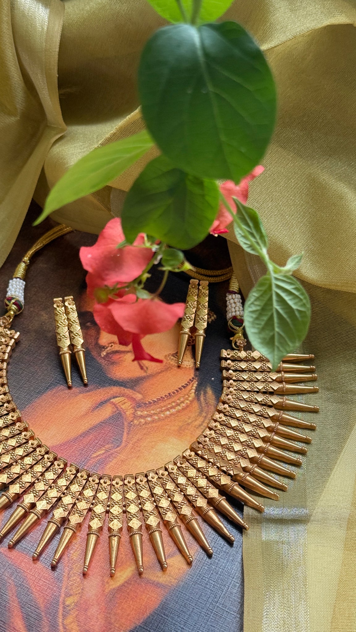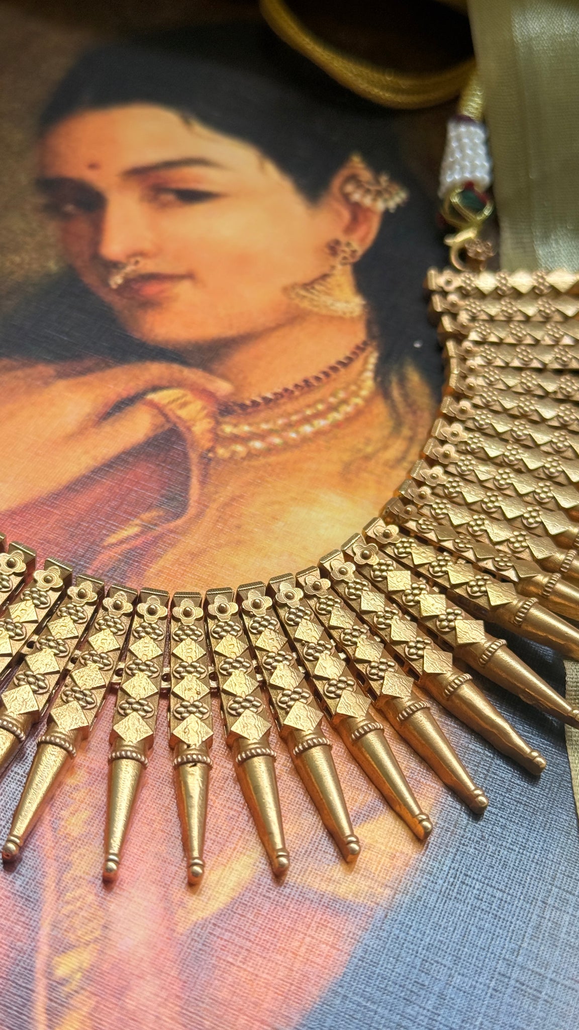 This statement festive necklace set is made with pure 92.5 silver .Featuring vintage style nakshi work inspired from the ancient temple architecture.The fine detailing reflects traditional craftsmanship,versatile piece that is made by our master artisan for our new festive collection,comes with a beautiful pair of earrings.