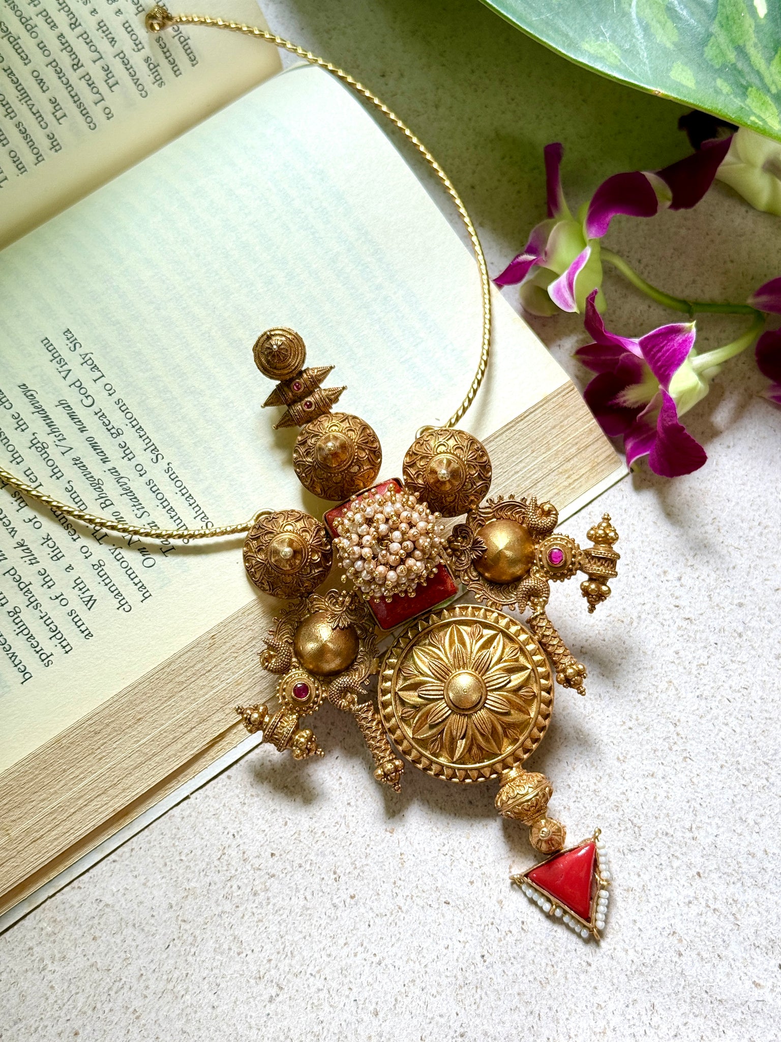 This one of a kind hasli is handcrafted in silver with a vintage style pendant along with embedded coral and cluster of pearls.This beautiful pendant is made by putting together all the vintage style pendants making it a standout piece.