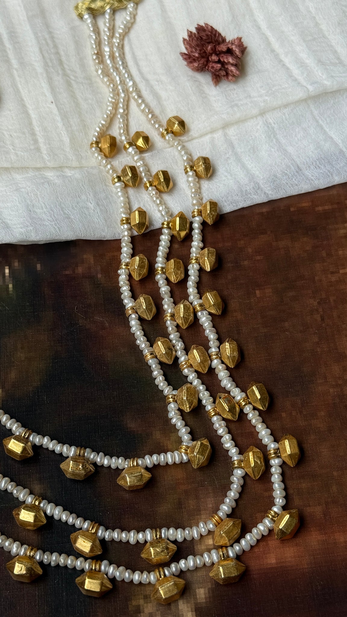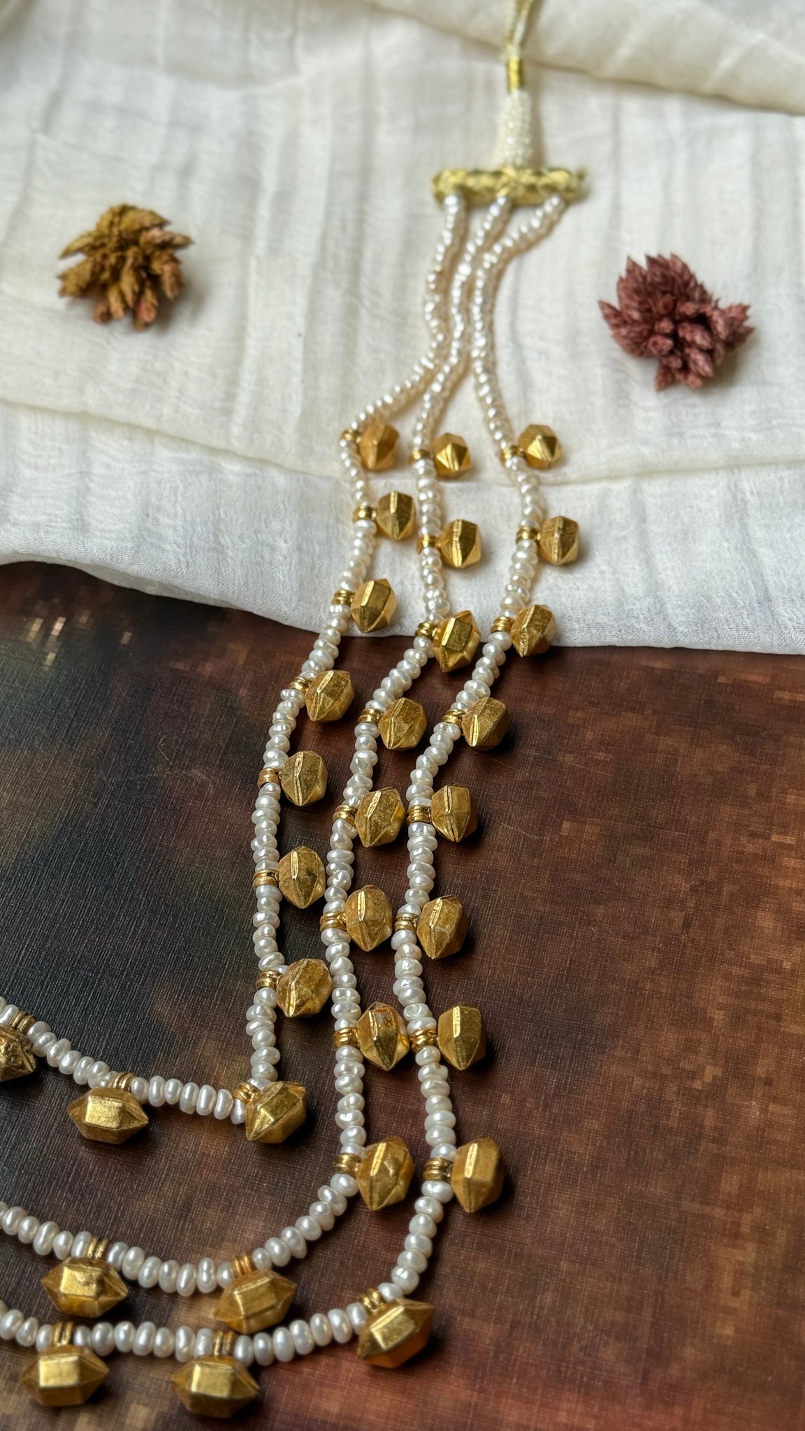This necklace is handcrafted in silver 92.5 with layered pearl chains with silver beads in between . A versatile piece that is made by our master artisan for our new collection .