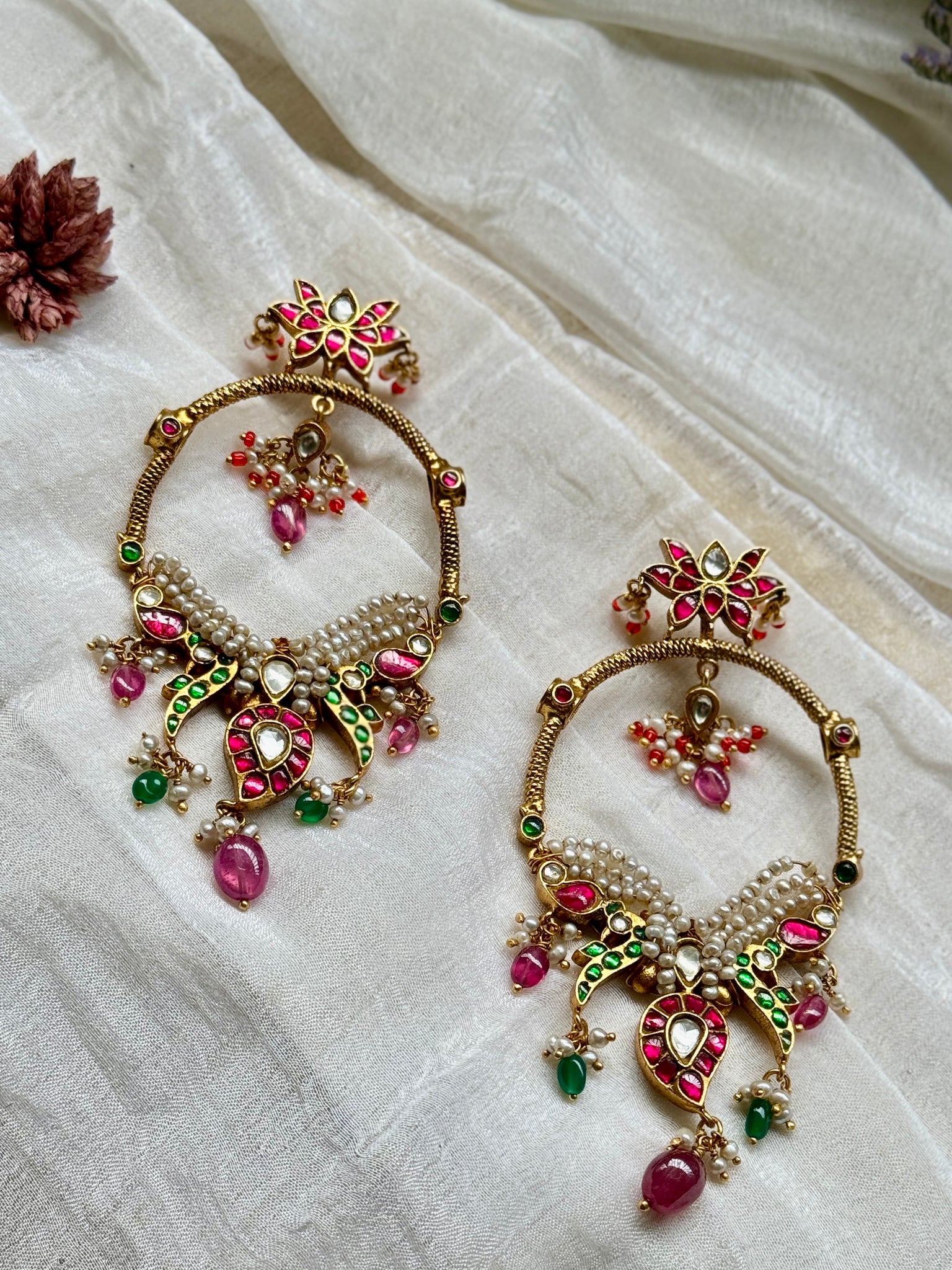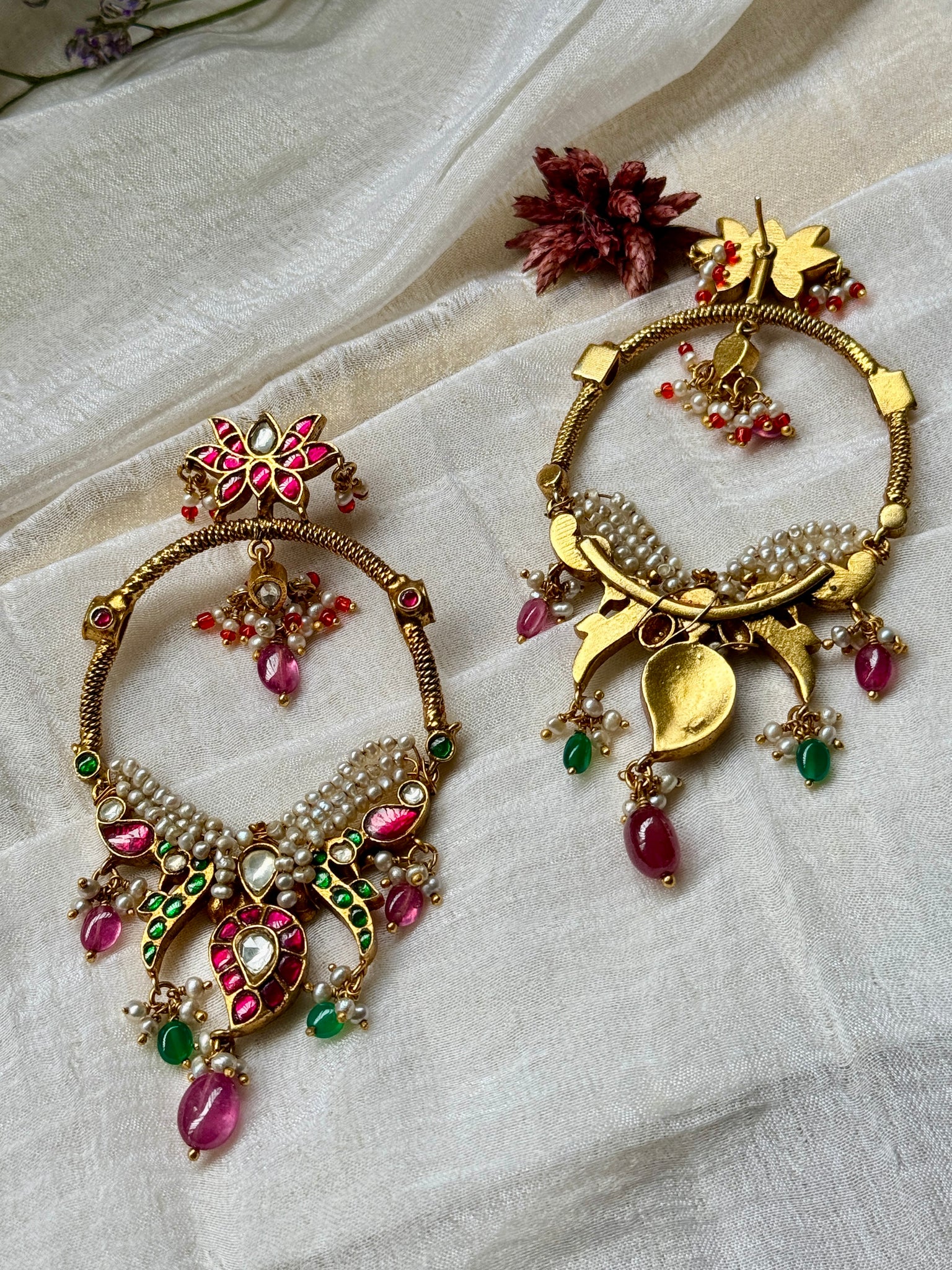 A pair of stunning silver 925 earrings in gold polish and kundan stones. These are a part of our nath collection and made by our skilled artisans.