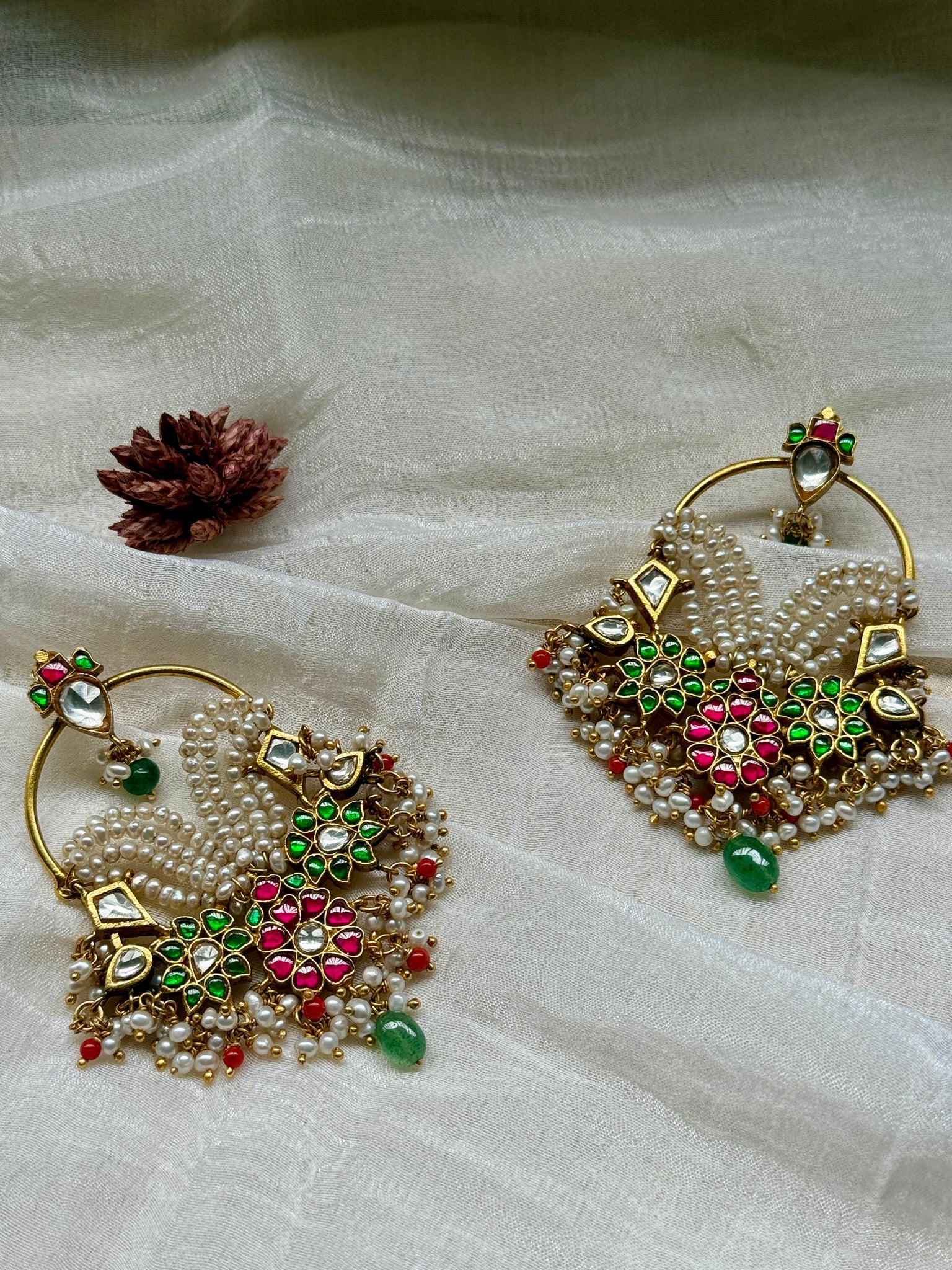 A pair of stunning silver 925 earrings in gold polish and kundan stones. These are a part of our nath collection and made by our skilled artisans.