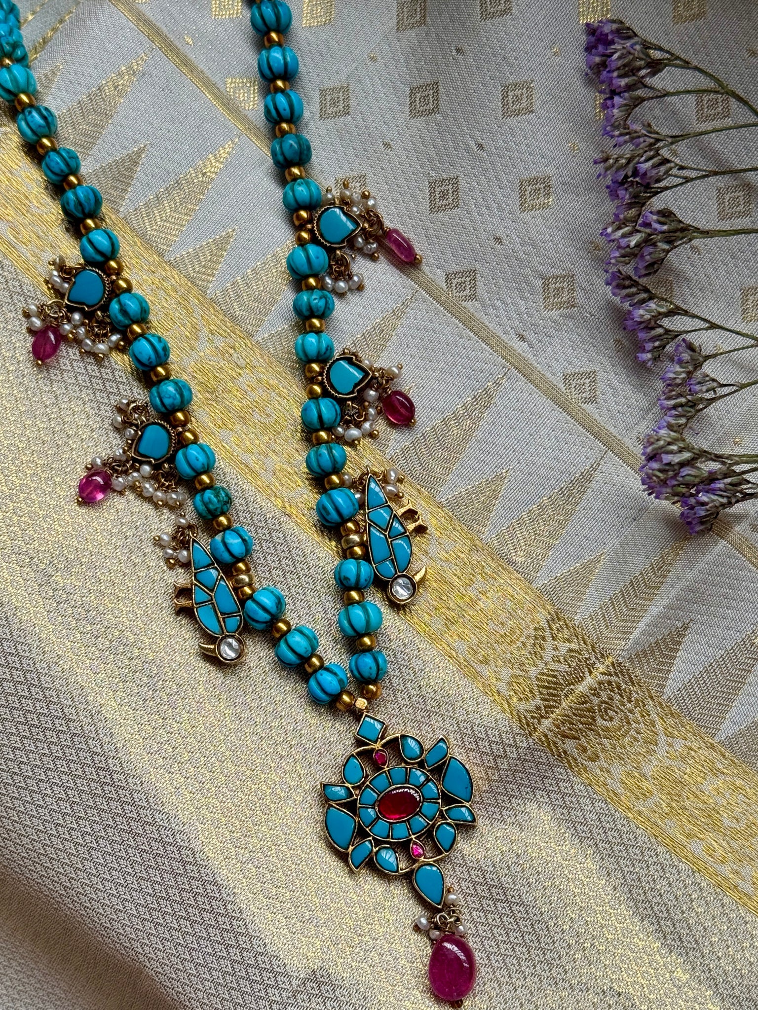 Handcrafted silver 92.5 and gold polish this one of a kind necklace with turquoise beads and turquoise stones in the pendant .