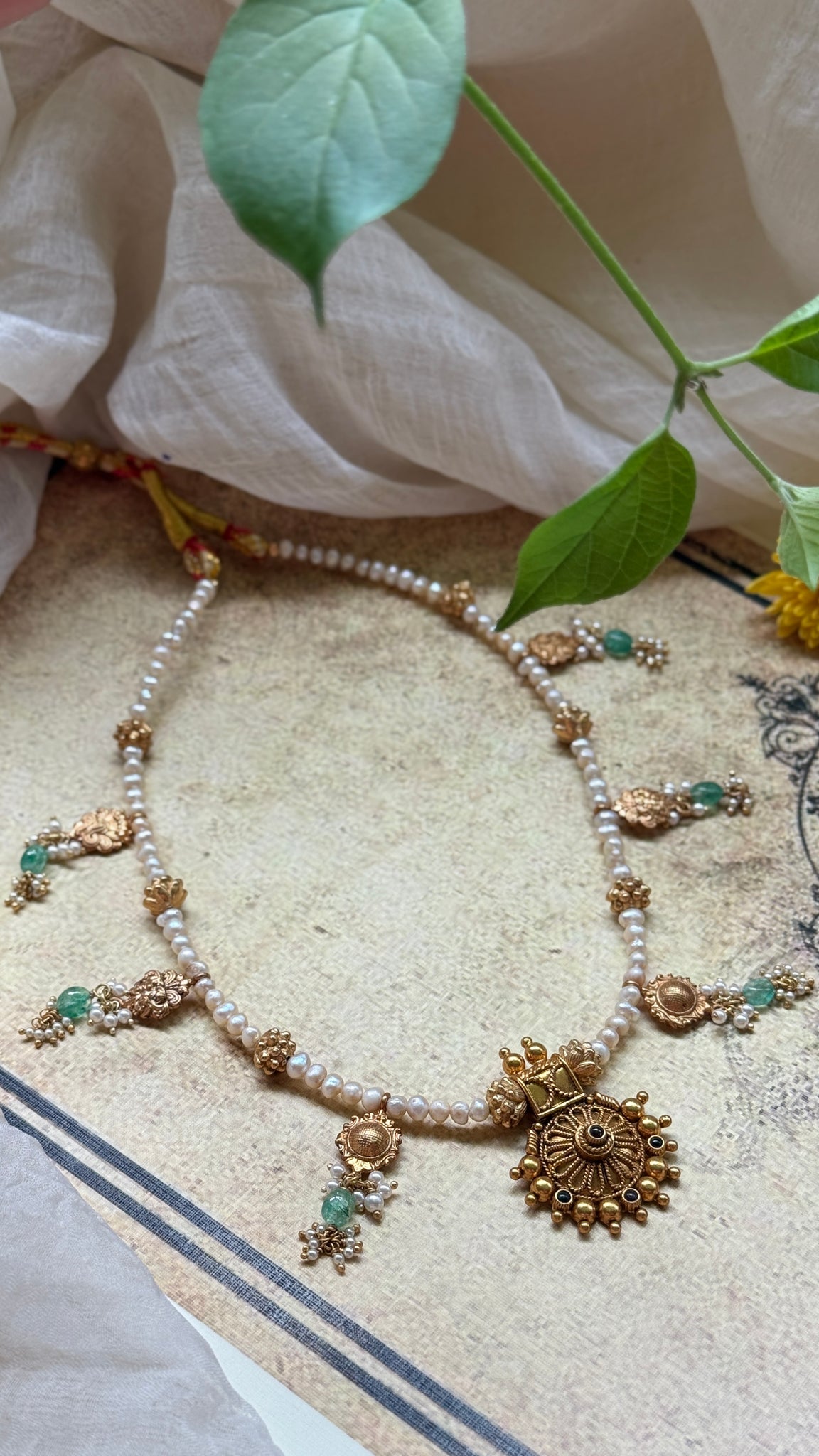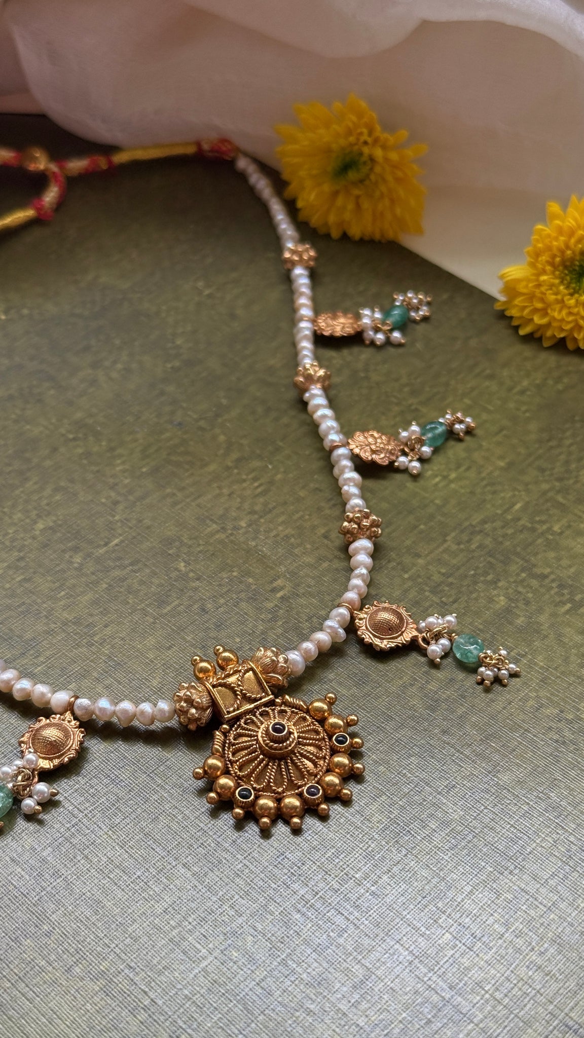 pearl necklace handcrafted in silver with rare intricate motifs and kundan stones . A versatile piece that is made by our master artisan for our new Diwali collection .