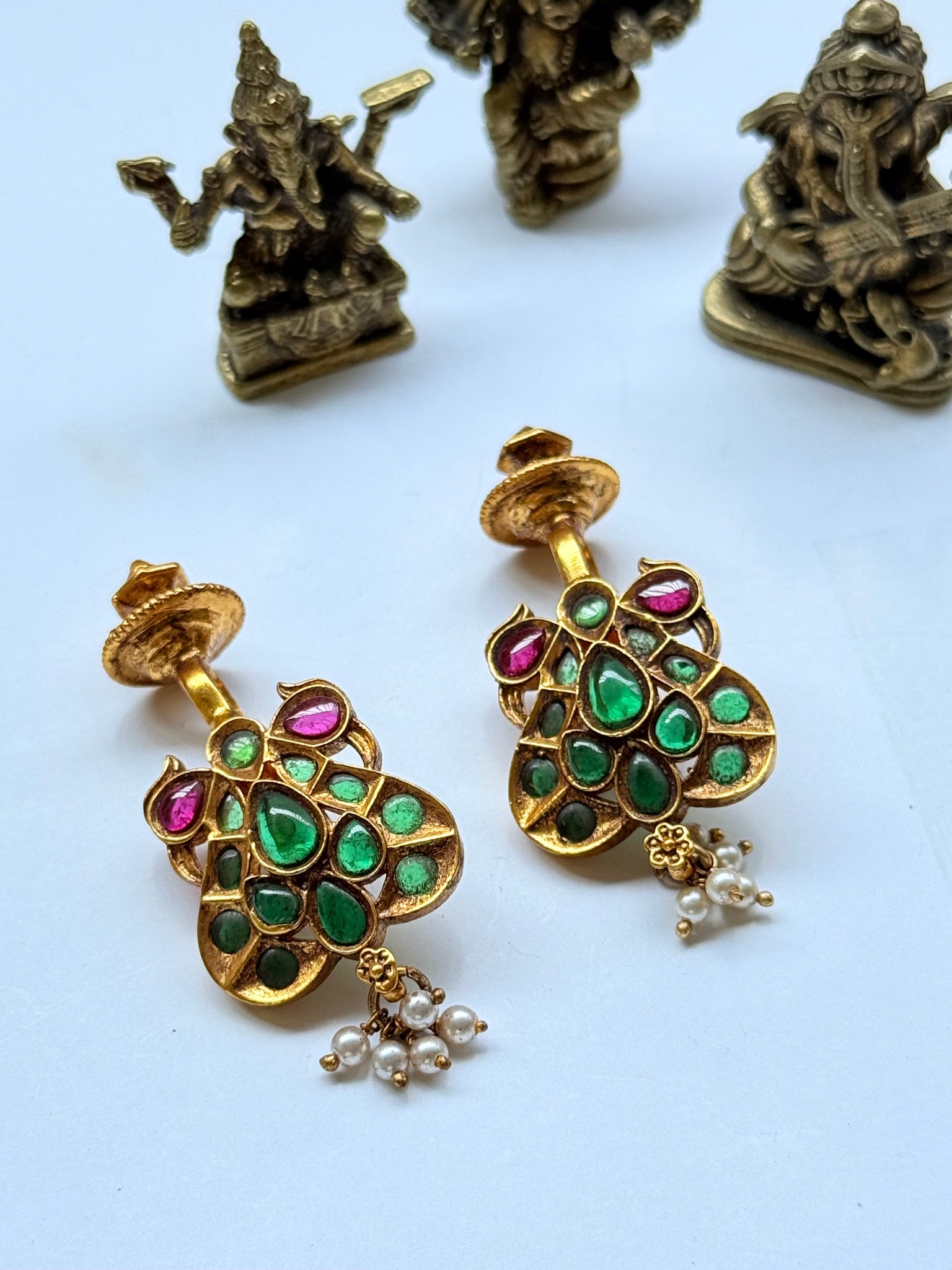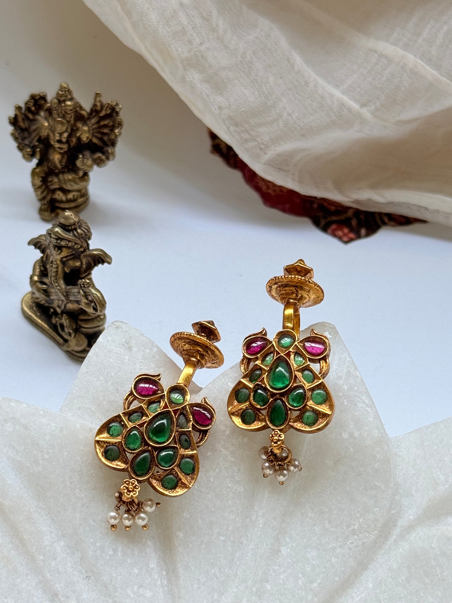 A pair of stunning silver 925 bugadi with stones. Can be worn without ear piercing. Inspired by traditional south Indian motifs. A limited collection only