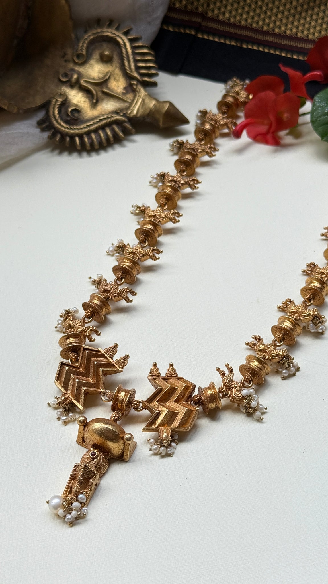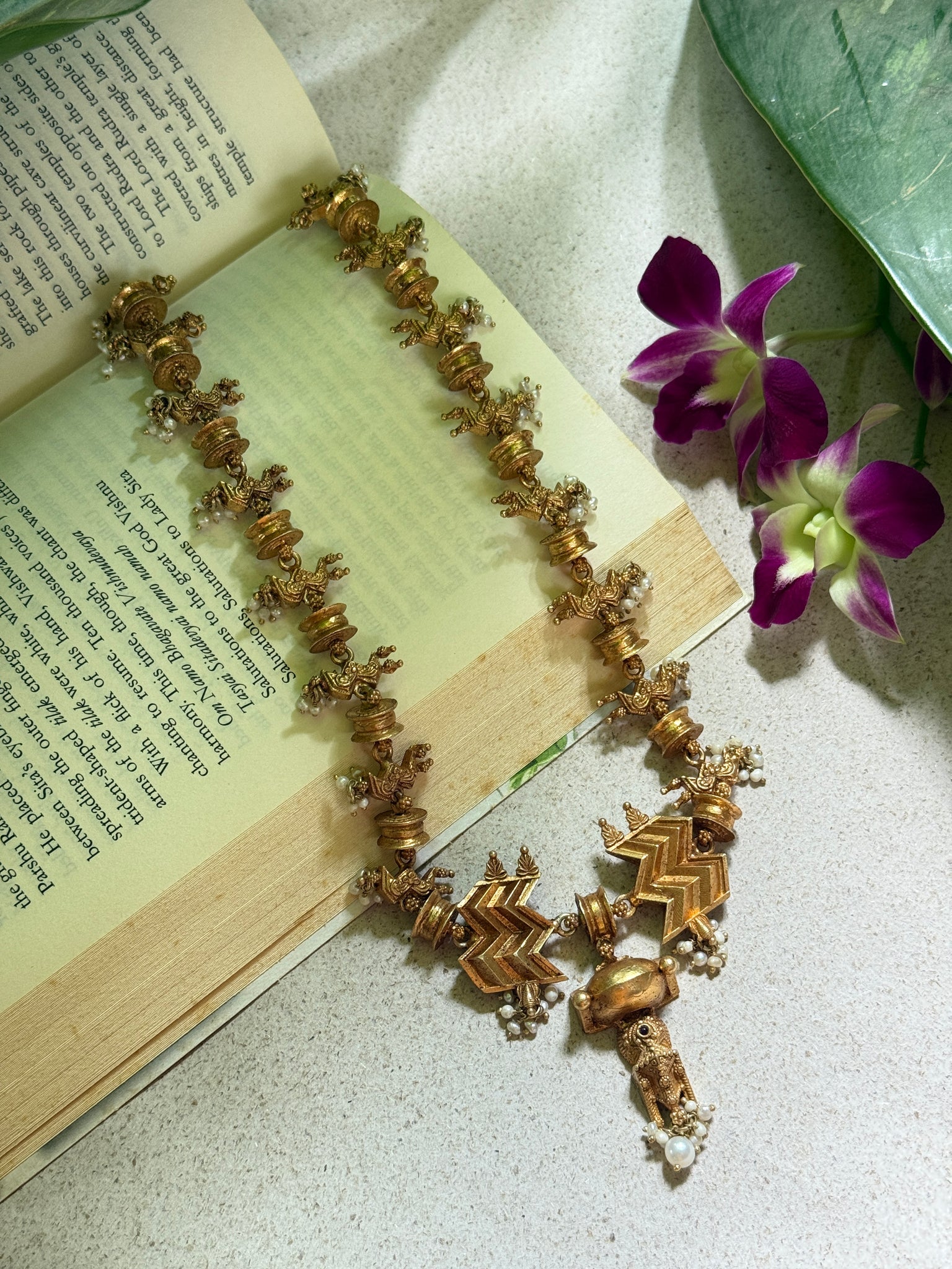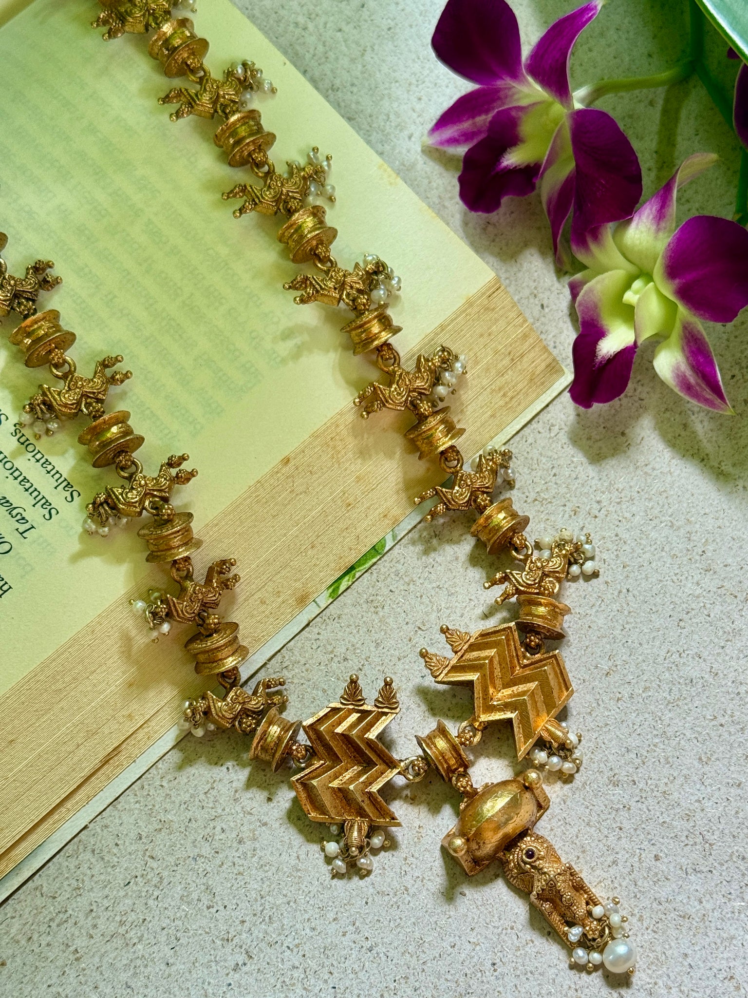 This statement necklace made with 92.5 silver featuring a beautiful series of interconnected vintage style pendants with gold polish along with pearl danglers. A versatile piece that is made by our master artisan for our vintage collection.