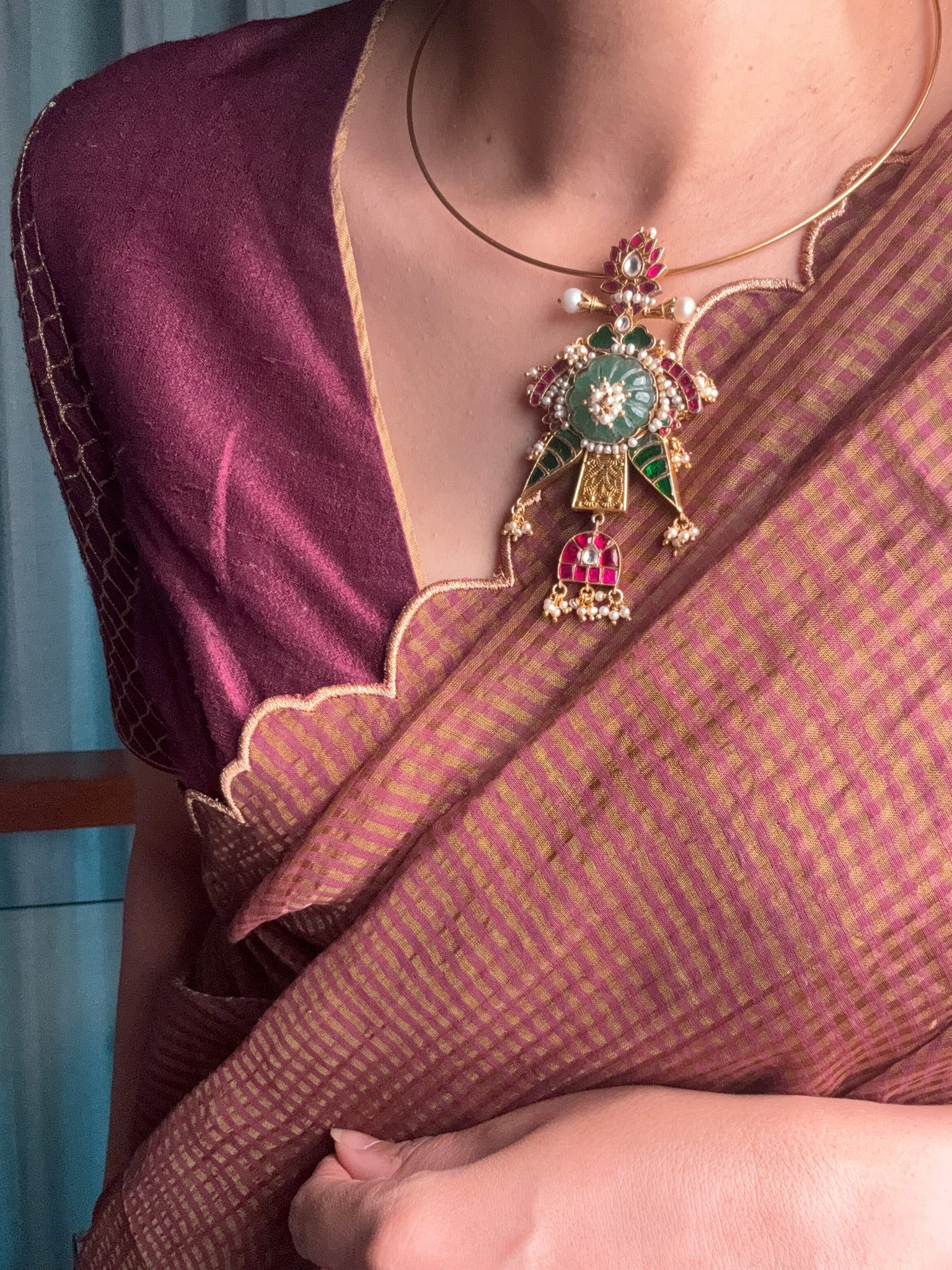This one of a kind hasli is handcrafted in silver with a vintage style pendant along with pearls. A versatile piece that is unique and can be easily pair with western & Indian outfits.