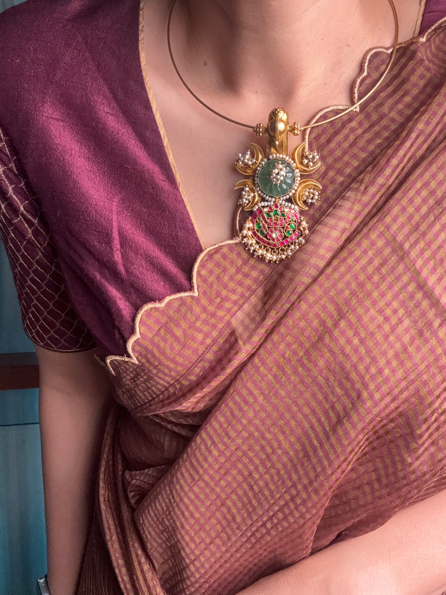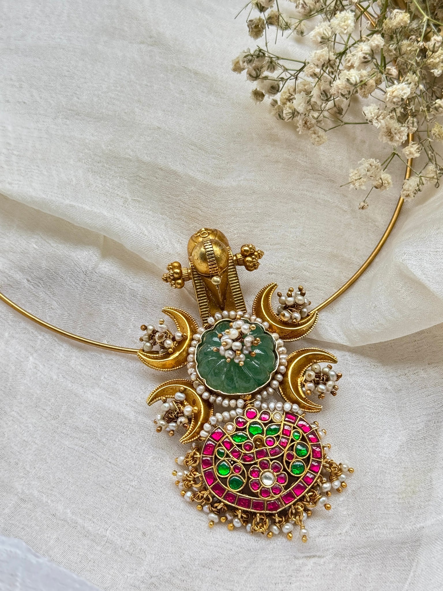 This one of a kind hasli is handcrafted in silver with a vintage style pendant along with pearls. A versatile piece that is unique and can be easily pair with western & Indian outfits.
