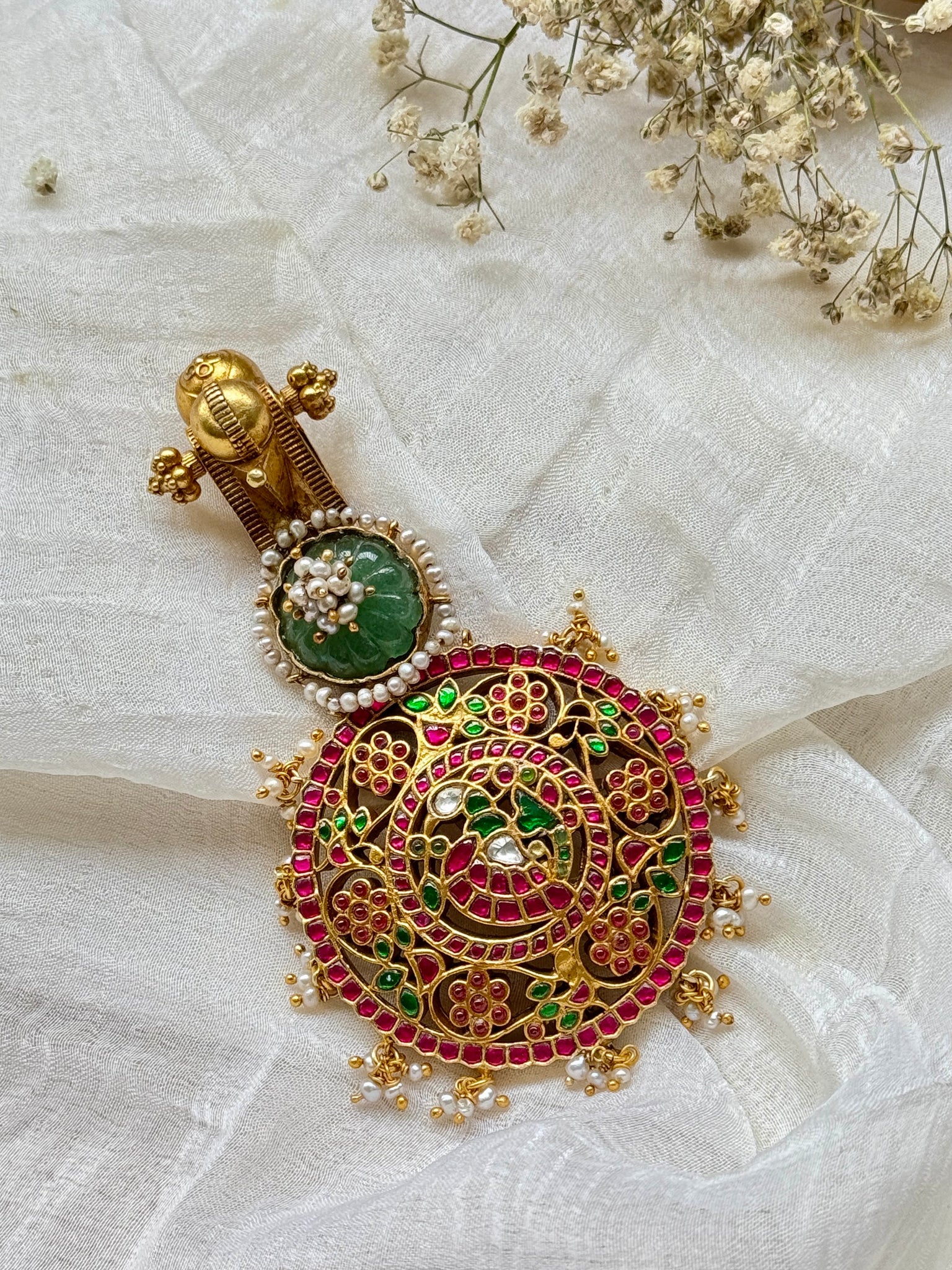 This one of a kind hasli is handcrafted in silver with a vintage style rakodi pendant along with pearls. A versatile piece that is unique and can be easily pair with western & Indian outfits.